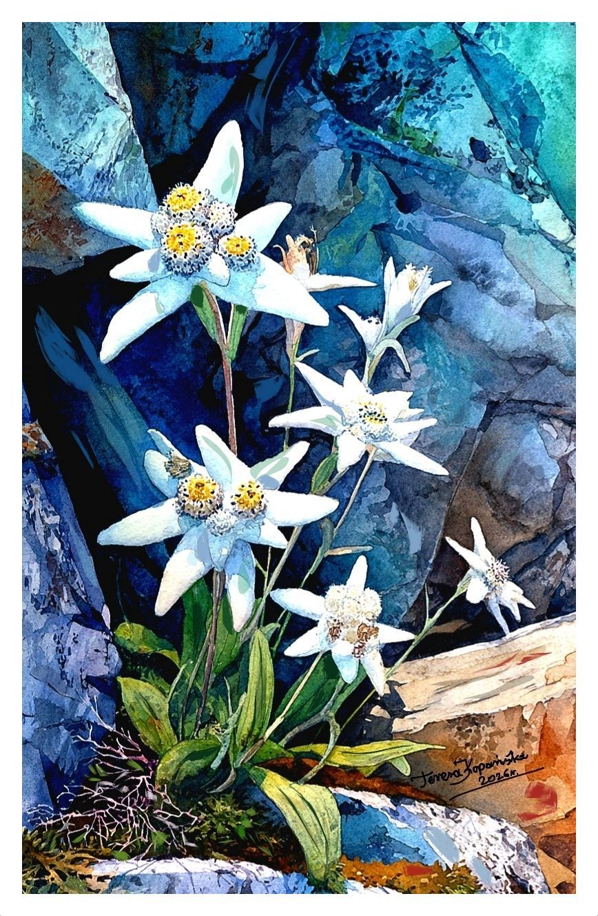 Przedstawiony obraz to praca polskiej malarki Teresy Kopańskiej. Dzieło nosi tytuł „Edelweiss, Biała Legenda” (Szarotka, Biała Legenda) i zostało namalowane w 2026 roku. Teresa Kopańska jest artystką plastykiem związaną z Łomżą, która w swojej twórczości wypracowała charakterystyczny, symbolistyczny styl. Jej technika malarska w przypadku obrazu „Edelweiss, Biała Legenda” oraz innych prac o tematyce florystycznej opiera się na kilku kluczowych elementach: Akwarela: Obraz został wykonany techniką akwarelową na papierze (np. Canson), co pozwala na uzyskanie subtelnych przejść tonalnych i świetlistości barw. Materiały wysokiej jakości: Artystka często stosuje profesjonalne farby akwarelowe (np. serii „Białe noce”), które zapewniają trwałość i intensywność kolorów. Detal i precyzja: W wielu swoich pracach Kopańska łączy malarstwo z rysunkiem, wykorzystując piórko do podkreślenia drobnych szczegółów, co widać w precyzyjnym oddaniu tekstury płatków szarotki. Światłocień: Charakterystyczne dla jej stylu jest operowanie kontrastem – jasne, niemal białe kwiaty szarotki silnie odcinają się od głębokich, błękitnych i granatowych cieni skalnego tła, co nadaje kompozycji trójwymiarowość. Autorka określa siebie mianem „kochanki malarstwa” i uważa, że sztuka powinna wypływać z wewnętrznej wolności i szczęścia. Jej prace są bardzo osobiste, często koncentrują się na pięknie natury (kwiaty, konie, pejzaże), którą przedstawia w sposób wyidealizowany, niemal magiczny. Warto zauważyć, że autorka chętnie powraca do motywu szarotek (włoska nazwa Stella Alpina), tworząc różne wariacje tego tematu na przestrzeni lat (np. wersje z 2020 i 2026 roku).