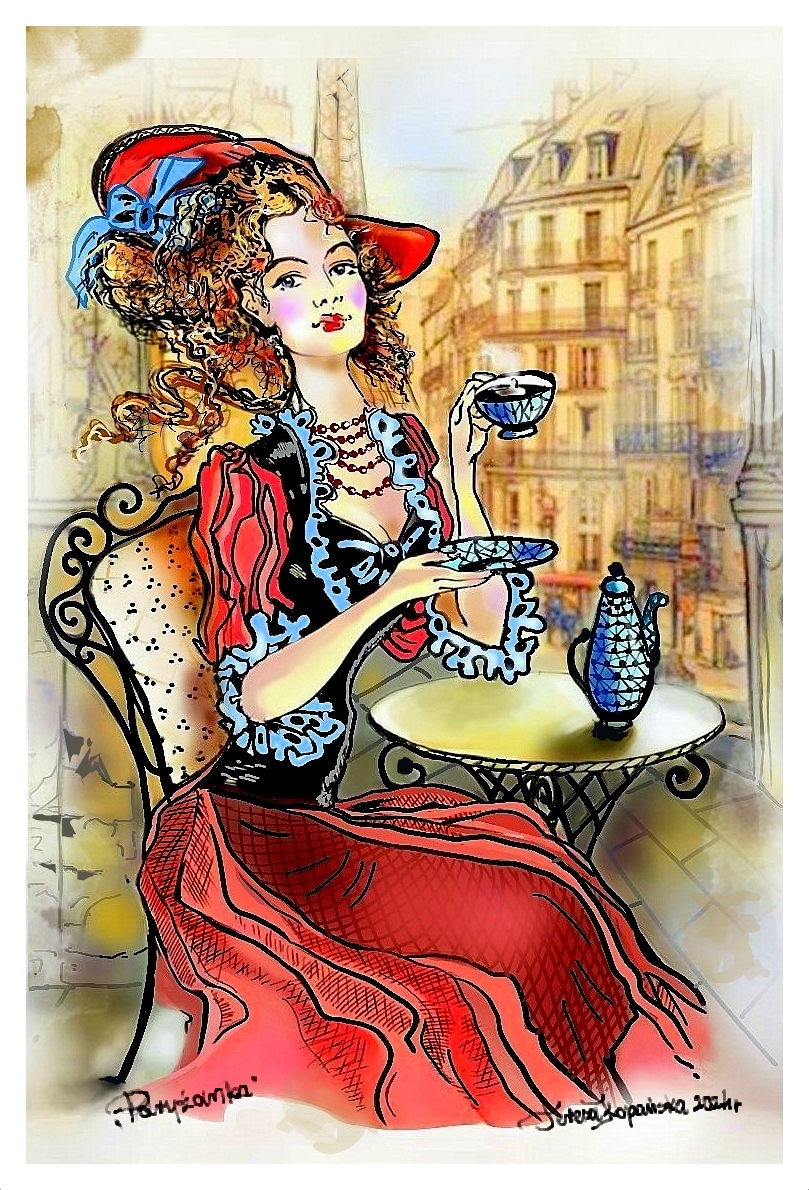 "Paryżanka" - akwarela. Praca wykonana techniką akwarelową na papierze akwarelowym firmy canson. Do malowania użyto najlepszych farb akwarelowych firmy "Białe noce" oraz kredą akwarelową. Wymiary: bez oprawy A 4 cm. Rok powstania 2024. Autor: artysta - plastyk, malarz Teresa Kopańska. Praca posiada sygnaturę z datą wykonania. Akwarelę "Paryżanka" - kupisz w oprawie - Passepartout (przykładowe ramki kartonowe, kolorystycznie dobrana do obrazu ) co załączam fotkę ramek.
