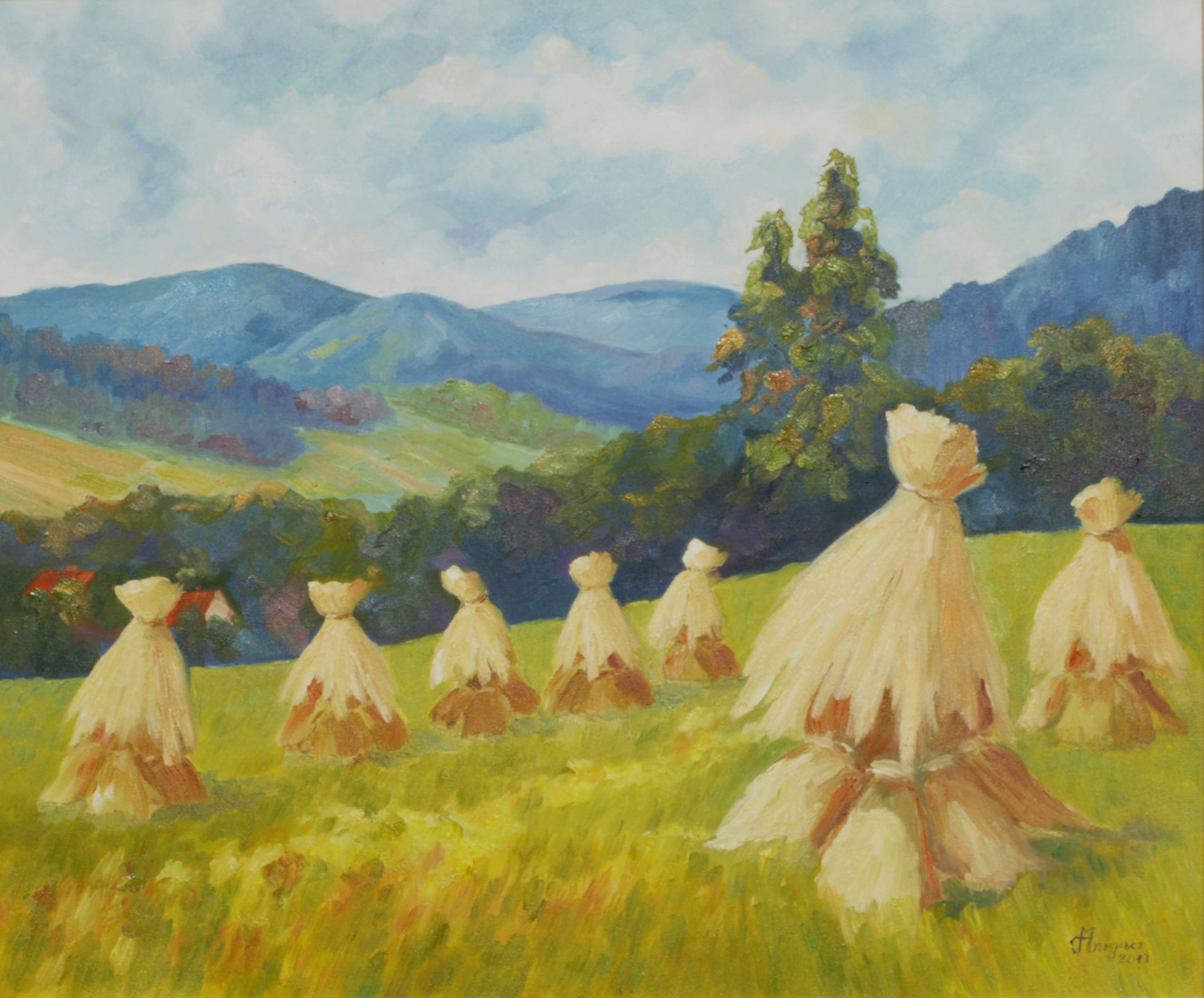 Obraz emanuje spokojem, ukazując malowniczy pejzaż pełen pastelowych barw. Na pierwszym planie widzimy stogi siana, które wyglądają jak małe kapelusiki na tle soczyście zielonej łąki. W oddali, majestatyczne góry w różnych odcieniach błękitu i zieleni, dodają głębi kompozycji, a niebo, pełne puszystych chmur, sprawia wrażenie, jakbyśmy mogli je dotknąć. Całość tworzy atmosferę sielskości, przypominając beztroskie dzieciństwo spędzane na wsi. Styl artysty jest bardzo realistyczny, ale jednocześnie delikatny, co nadaje obrazowi magiczną aurę. Technika malarska opiera się na subtelnych pociągnięciach pędzla i harmonijnym zestawieniu kolorów. Można poczuć ciepły wiatr, dotykający twarzy podczas letniego popołudnia. Obrazy takie, pełne nostalgic magic, często wywołują w nas wspomnienia dawnych lat i marzenia o prostym, szczęśliwym życiu. Myślę sobie: „ale fajnie by było bawić się w chowanego między tymi stogami!” Czy nie przyprawia to każdego o uśmiech? To dzieło może być jak balsam na duszę, przypominając nam o pięknie natury i chwili zatrzymania się w codziennym biegu. Osobiście zerkałbym na ten obraz godzinami. Co za magiczny place, prawda?