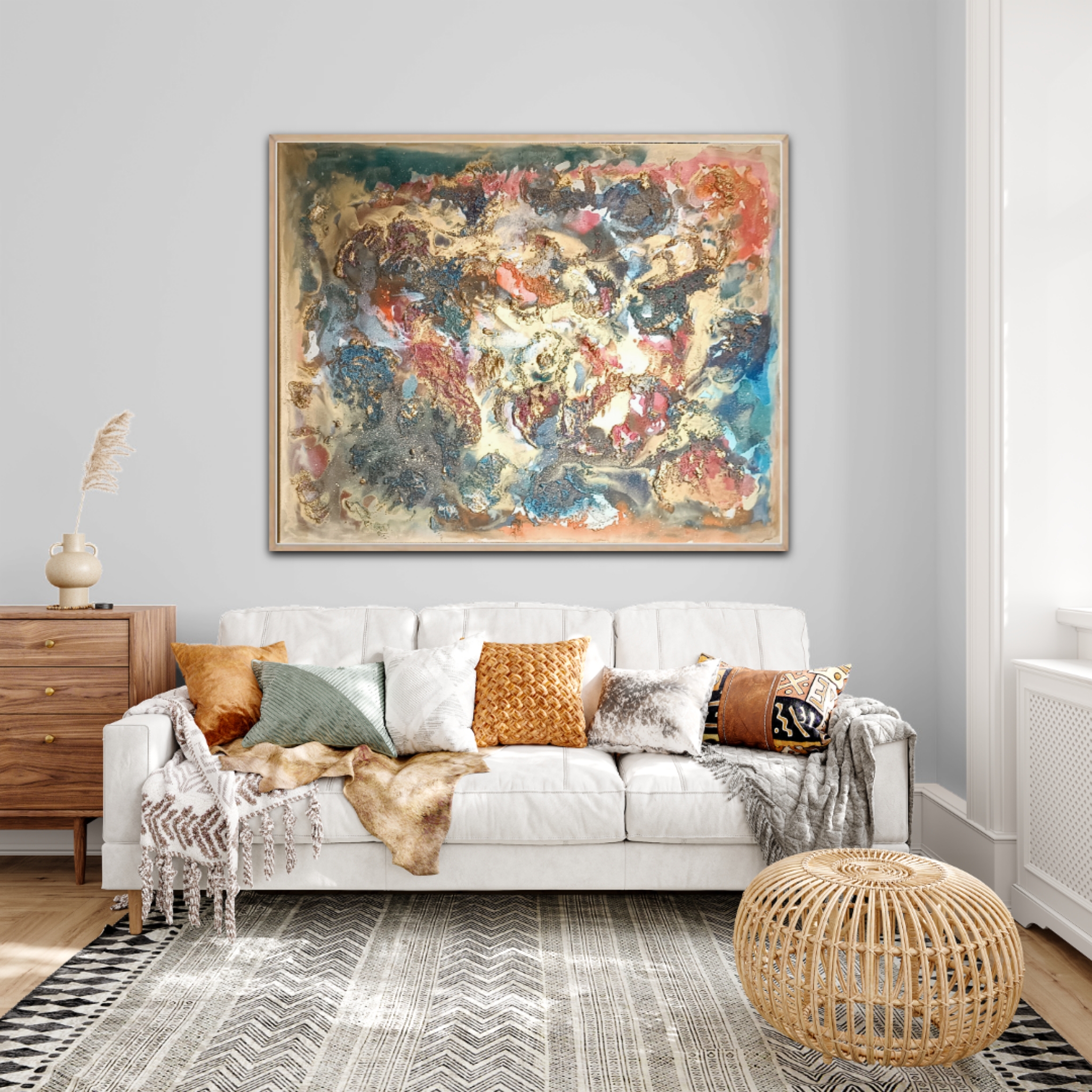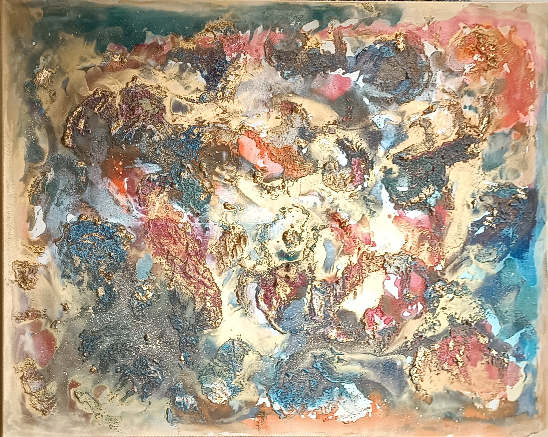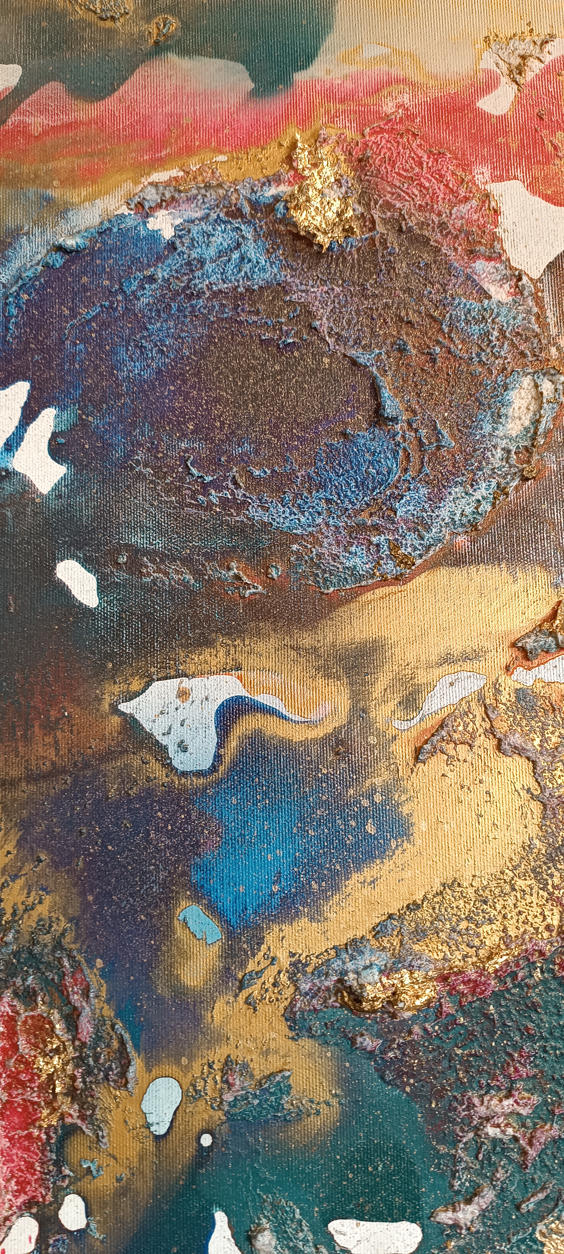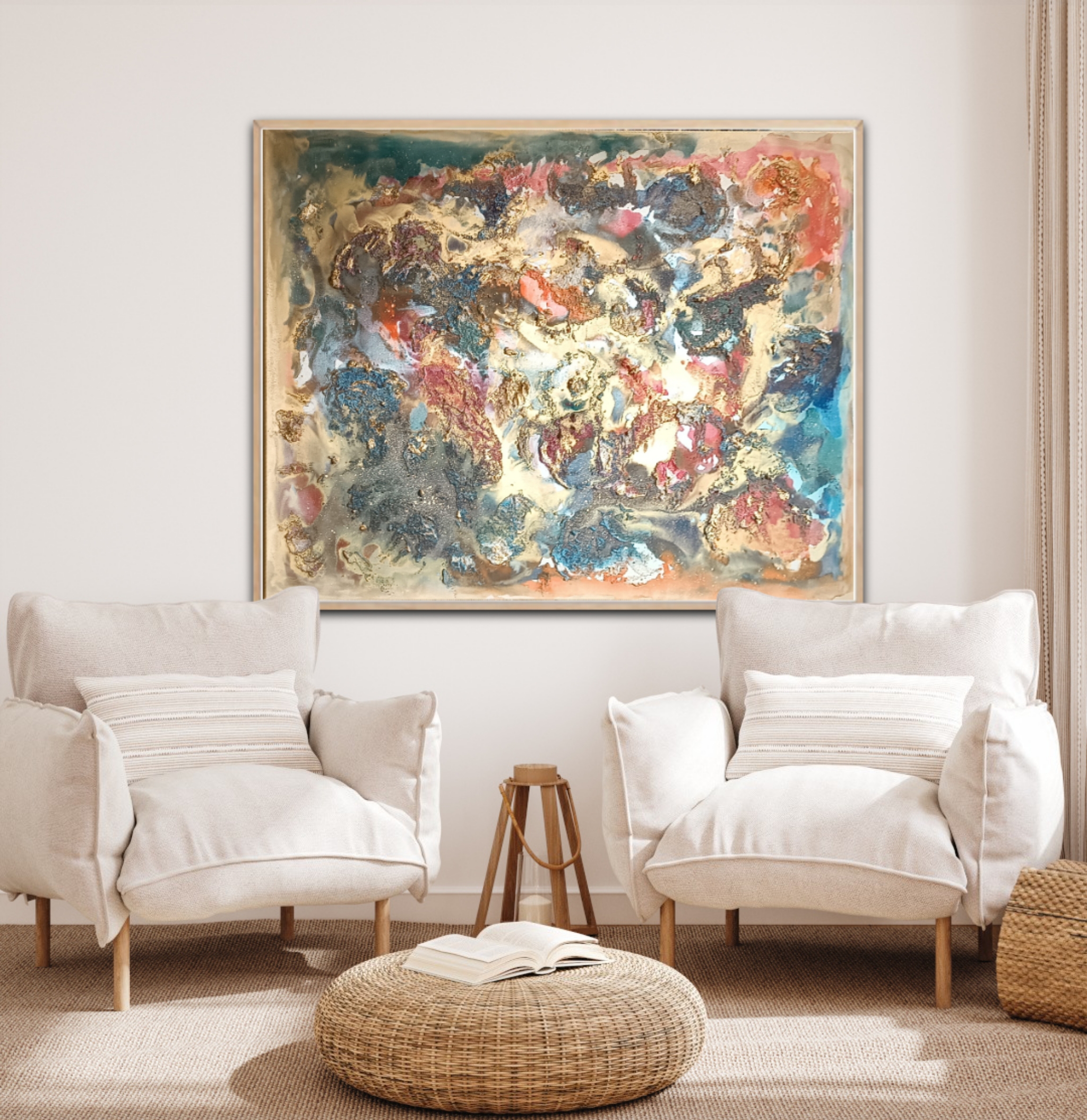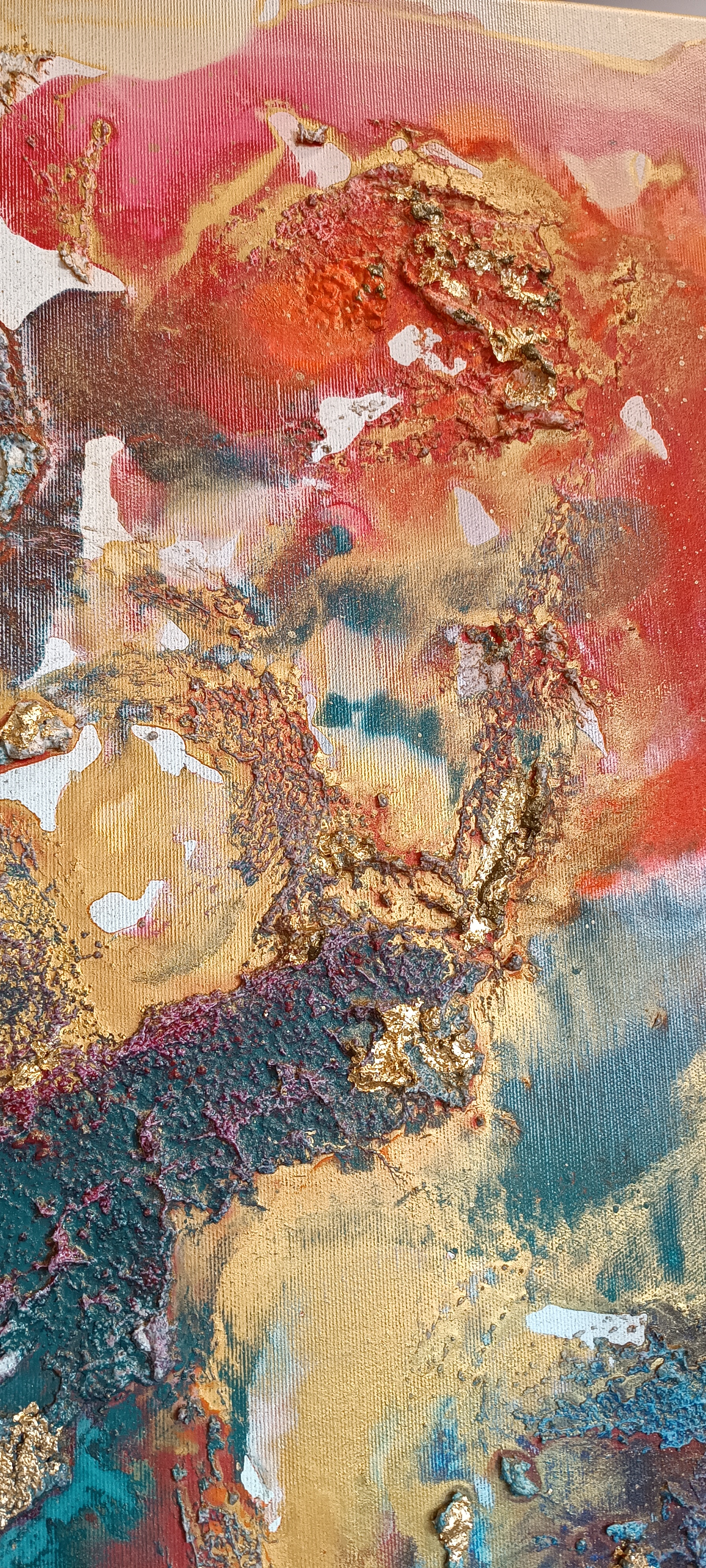 Dynamiczna kompozycja, która oddaje nieuchwytne piękno natury w ciągłym ruchu. Bogata paleta barw – od głębokich błękitów, intensywnych czerwieni i różów, po delikatne złote refleksy – nawiązuje do migotania światła na powierzchni wody o zachodzie słońca. Wyrazista struktura obrazu tworzy unikalny trójwymiarowy efekt, który zmienia się w zależności od kąta padania światła. Inspiracją dla tego dzieła była magia światła i koloru w naturze: spektakularne zachody słońca, rozświetlone niebo oraz refleksy na wodzie. To wyjątkowy obraz, który wprowadzi do każdego wnętrza energię, harmonię i odrobinę luksusu. • Rozmiar: 140 x 100 cm. • Technika: Akrylylowy pigment na płótnie z wyrazistą strukturą i metalicznymi akcentami • Rok: 2024 Akryl, pigment, pasta strukturalna, tusze na płótnie.
