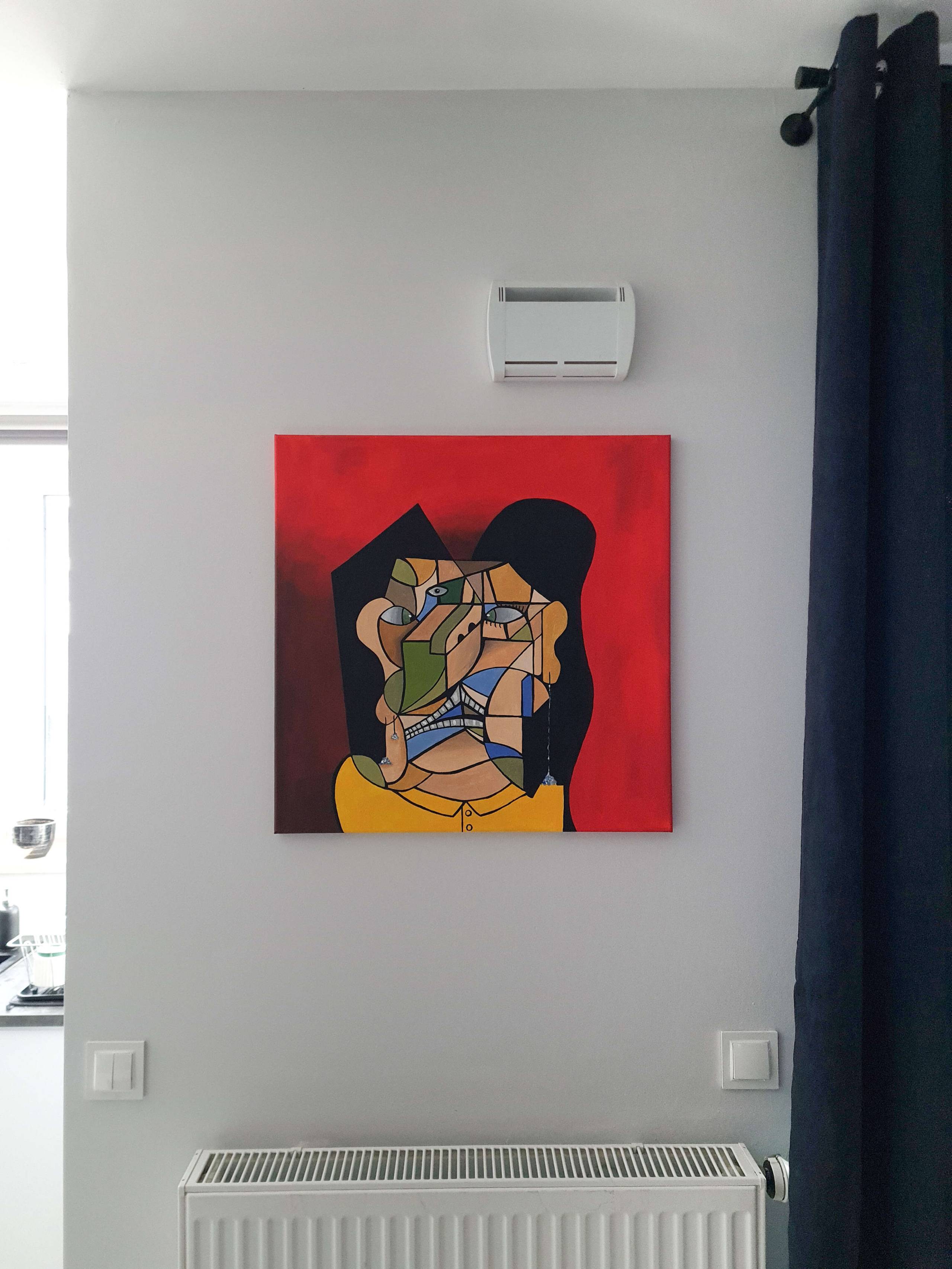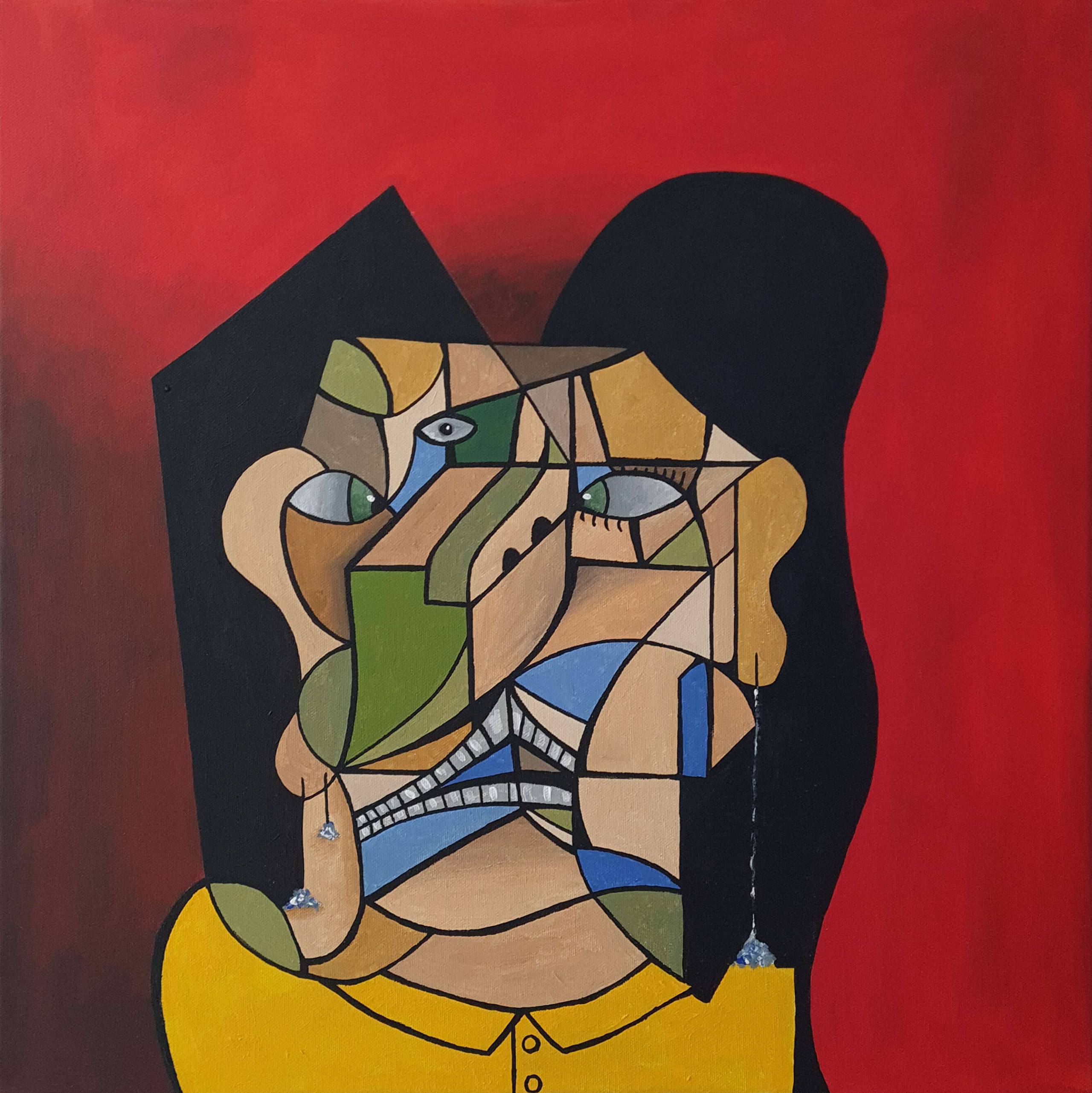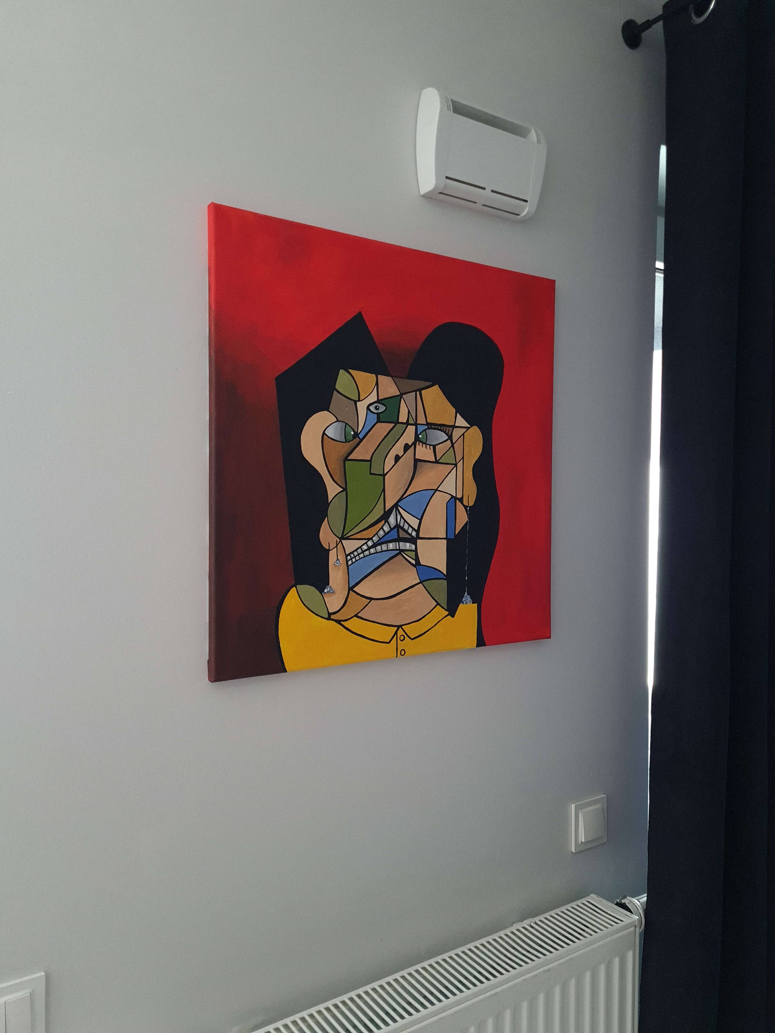 Na obrazie dominują intensywne kolory, na czele z głęboką czerwienią tła, która zdaje się pulsować życiem. W centrum widzimy złożoną kompozycję przypominającą mozaikę, pełną geometrycznych kształtów. Twarz zbudowana jest z fragmentów w odcieniach zieleni, beżu i błękitu, a całość dopełnia kontrastująca, czarna sylwetka. Artysta zastosował technikę bliską kubizmowi, gdzie rzeczywistość rozbita jest na wielościany. Atmosfera obrazu jest nieco tajemnicza, niemal surrealistyczna, a jednocześnie fascynująca. Patrzę na to dzieło i czuję zagadkowość. Może trochę dezorientację, ale w pozytywnym sensie. Te różne kawałki twarzy sprawiają, że człowiek się zastanawia. Jakby artysta chciał nam powiedzieć: "Hey, look at me!". Obraz sprawia wrażenie, że ma coś ważnego do przekazania, ale robi to w subtelny sposób. To trochę jak zabawa w odkrywanie tajemnic. Mój pies też tak się czasem gubi w parku! Co tu się dzieje? To pierwsza myśl, jaka przyszła mi do głowy. Artysta, zdaje się, bawi się z widzem, zmuszając go do składania układanki z emocji i kształtów. Można poczuć ciekawość, a zarazem lekką melancholię. To dzieło, które sprawia, że chcesz na chwilę przystanąć i zanurzyć się w świecie przedstawionym na płótnie.