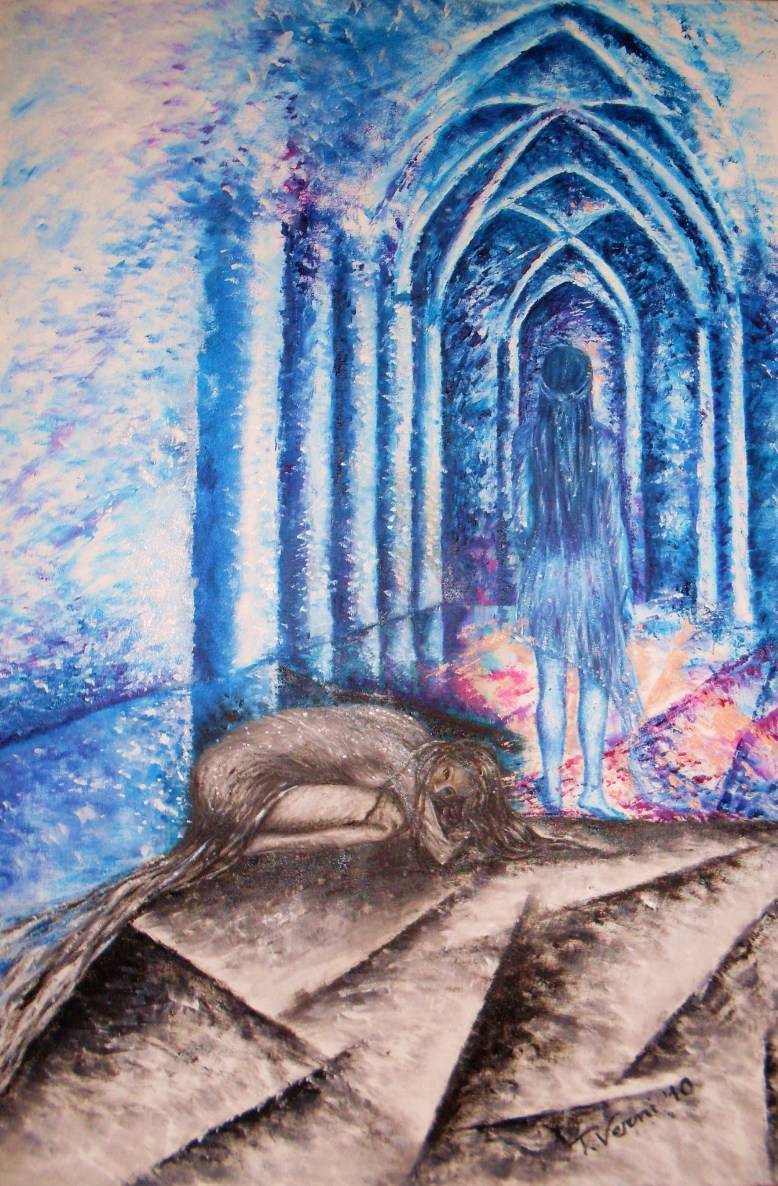 Obraz ukazuje tajemniczą scenerię zdominowaną przez odcienie błękitu i fioletu. Centralnym elementem jest postać kobiety stojącej tyłem do widza, zanurzona w mistycznym, gotyckim korytarzu o sklepieniach łukowych. Jej długie włosy spływają niczym wodospad. Na pierwszym planie leży skulona postać, spowita w szarości, co kontrastuje z barwną resztą obrazu. Kiedy patrzę na to dzieło, czuję się jakbym wkraczał do marzenia sennego, gdzie czas płynie wolniej. Szczególnie intrygujący jest sposób, w jaki artysta używa techniki impasto, nakładając grubą warstwę farby, co nadaje głębi i dynamiczności. Światło jest delikatne, nieco rozmyte, co wprowadza nastrój melancholii. Czyż to nie jest przypomnienie o naszych najbardziej ukrytych lękach? Oczy widza mogą zanurzyć się w obrazie, krążąc bez końca po labiryntach myśli. „Wow, ale fajnie niebiesko!” - powiedziałby mały chłopiec. Sztuka ta skłania do refleksji, zadumania nad esencją własnej podświadomości. Obraz jest "mysterious", zaprasza do kontemplacji i poszukiwania znaczeń skrytych gdzieś pomiędzy liniami i barwami.