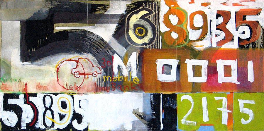Kolorowy świat cyfr i liter na obrazie zdaje się krzyczeć do nas swym chaosem i dynamiką. Dominują jasne kolory: czerwony, pomarańcz, biały, które mieszają się z ciemnymi, kontrastującymi akcentami czerni i zieleniego. Angielskie słowo "mobile" dodaje znaczenia, jakbyśmy byli w środku cyfrowego miasta. Kształty są nieregularne, lecz przemyślane, a kompozycja sugeruje ruch i zmianę. Ten obraz to prawdziwe miejskie "chaos". Atmosfera jest pełna energii, jakbyśmy byli na wielkim placu z mnóstwem reklam. Techniki artystyczne wydają się być mieszanką malarstwa abstrakcyjnego z kolażem, z elementami ręcznego pisma, co dodaje osobistego charakteru. Może wywołać uczucie zagubienia, ale też i fascynacji tym cyfrowym światem. A ja sobie myślę, że to wszystko wygląda jak wielka zabawa przypominająca nam o codziennej gonitwie za nowościami. Obraz budzi refleksję nad współczesnością, gdzie liczby i technologie dominują nasze życie. Sprawia, że zatrzymujemy się na chwilę, by poczuć ten niepowtarzalny, intensywny klimat.