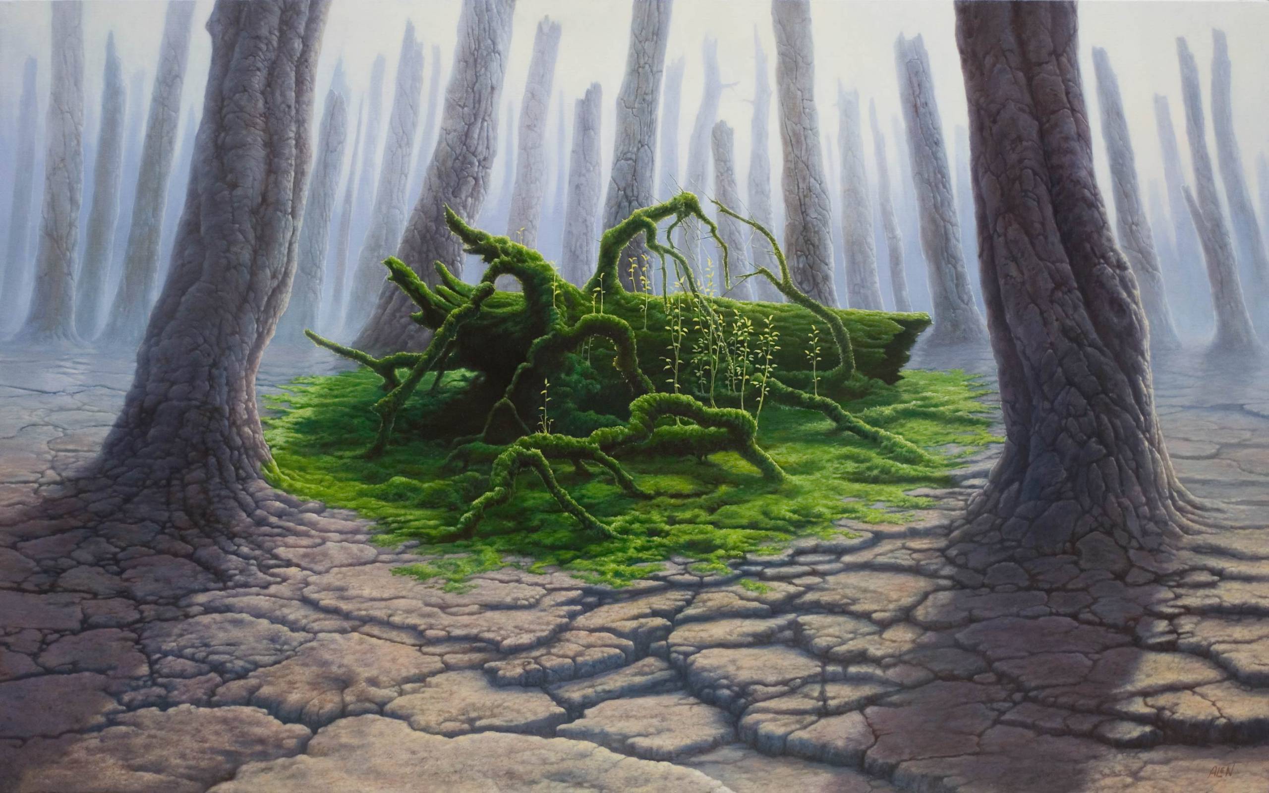Na obrazie dominuje tajemniczy las z szarymi, strzelistymi pniami drzew, które wydają się wieść w nieskończoność. Ziemia pokryta jest pękniętą, suchą glebą, a pośrodku obrazu wyłania się soczyście zielona plama mchu, kontrastująca z otoczeniem. Centralnym punktem jest powalony pień drzewa, opleciony żywym mchem i kilkoma delikatnymi pędami roślin. Atmosfera dzieła jest nieco surrealistyczna, przywołując skojarzenia z miejscem zapomnianym przez czas. Gdybym był dzieckiem, powiedziałbym "to las z bajki!". Artysta zastosował technikę realistyczną, z dbałością o detale i grę świateł, co dodaje obrazowi głębokości. Kolorytu dodał stonowany, subtelny kolor nieba, który wprowadza spokojny nastrój. Obraz może budzić refleksję nad przemijaniem i odradzaniem się natury. Czy można poczuć tu coś więcej? Może tęsknotę za przyrodą? Albo zastanowienie, jak natura potrafi reclaim wszystko, co utracone. Oto magia tego miejsca - przypomina, że nawet wśród popiołu może powstać coś żywego i pięknego, a 'hope' jest w zasięgu każdego z nas.