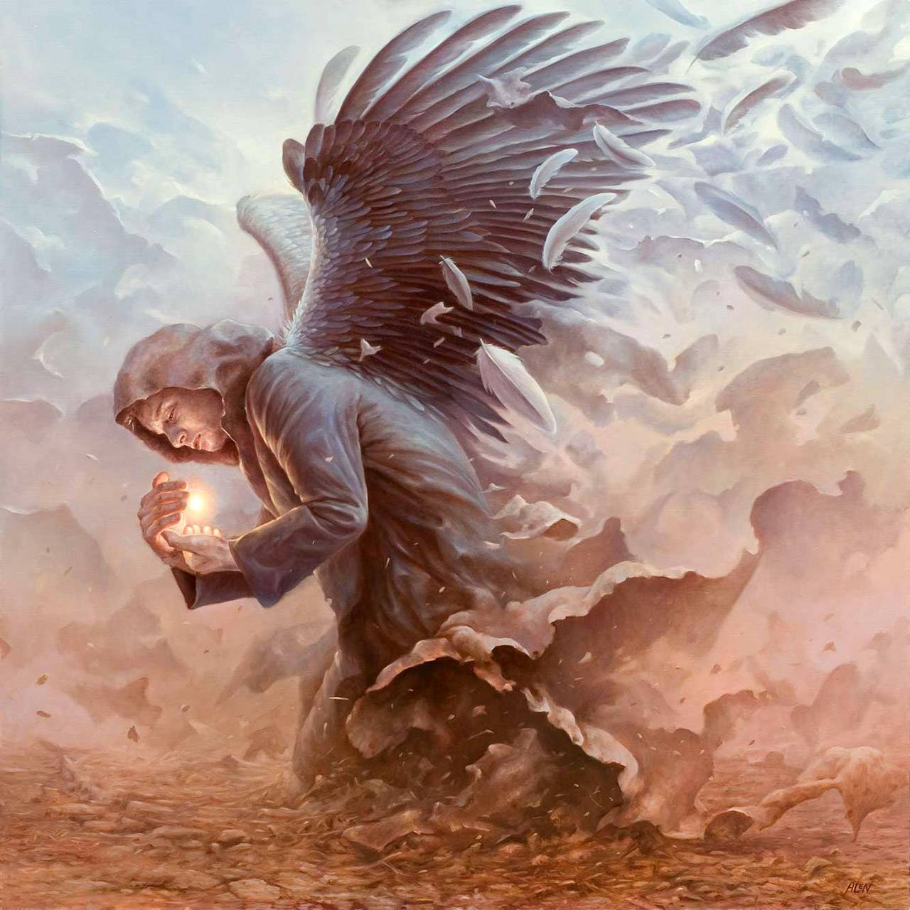 Na obrazie widzimy postać tajemniczego anioła. Jego majestatyczne, czarne skrzydła rozpościerają się nad postacią, jakby zaraz miały porwać ją w powietrze. Ubrany w ciemny płaszcz z kapturem, anioł klęczy, trzymając delikatnie w dłoniach mały płomień. Atmosfera jest pełna zadumy i melancholii. Kolory obrazu to mieszanka szarości, granatów i subtelnych beży, które przeplatają się na tle mglistych chmur. Artysta zastosował technikę łagodnych pociągnięć pędzla, co nadaje dziełu eteryczny charakter. Ciepło bijące z płomienia kontrastuje z chłodnym otoczeniem, dając poczucie nadziei. Oglądając ten obraz, można poczuć uczucie spokoju i bezpieczeństwa, choć jednocześnie wisi nad nimi nuta tajemnicy. Czy to płomień nowej drogi, czy może symbol straconych nadziei? Wow, jakie piękne! Technika użyta przez artystę sprawia, że wszystko jest takie soft, almost dreamlike. Na myśl przychodzą refleksje o kruchości życia i nieskończonej sile nadziei. Chęć wzniesienia się ponad to, co przyziemne, jest niemal namacalna. To dzieło dla tych, którzy szukają pocieszenia w sztuce.