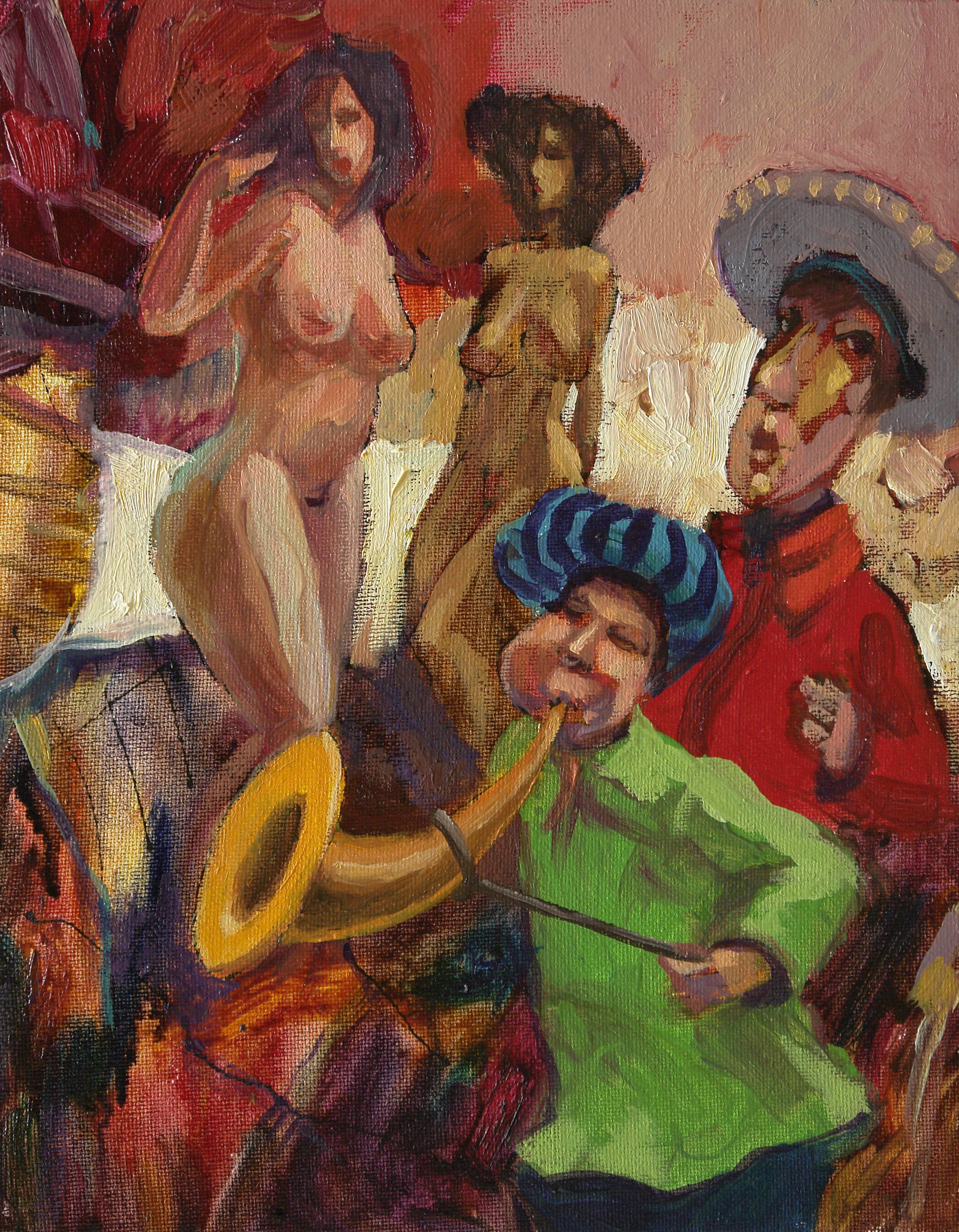 Obraz tętni życiem i fantazją, pełen intensywnych kolorów, jak czerwień, zieleń i złoto. Postacie na obrazie zdają się tańczyć w chaotycznym rytmie. Figury są zdeformowane, co dodaje surrealistycznego klimatu. Artysta użył szerokich, ekspresyjnych pociągnięć pędzla. Na pierwszym planie widzimy chłopca w zielonej koszuli, dmuchającego w ogromny róg. Tuż obok, człowiek w sombrero wpatruje się w dal. Może filozofuje? Atmosfera jest lekko niepokojąca, ale i intrygująca. Obraz wydaje się opowiadać historię, może to być dramatyczna fiesta w sercu miasta. Czy ktoś krzyknął "Woohoo!"? Artysta postawił na dynamikę i ruch, przywołując emocje zarówno radości, jak i zadumy. Myślę, że warto się w to wpatrzyć, bo za każdym razem odkrywamy coś nowego. Dziecko powiedziałoby: "Pan z trąbką ma zabawny kapelusz!" Kompozycja jest nietypowa, pełna energii i tajemnicy. Patrząc, ma się wrażenie, że to równocześnie sen i rzeczywistość. Obraz prowokuje do zastanowienia się, co naprawdę widzimy i co czujemy.