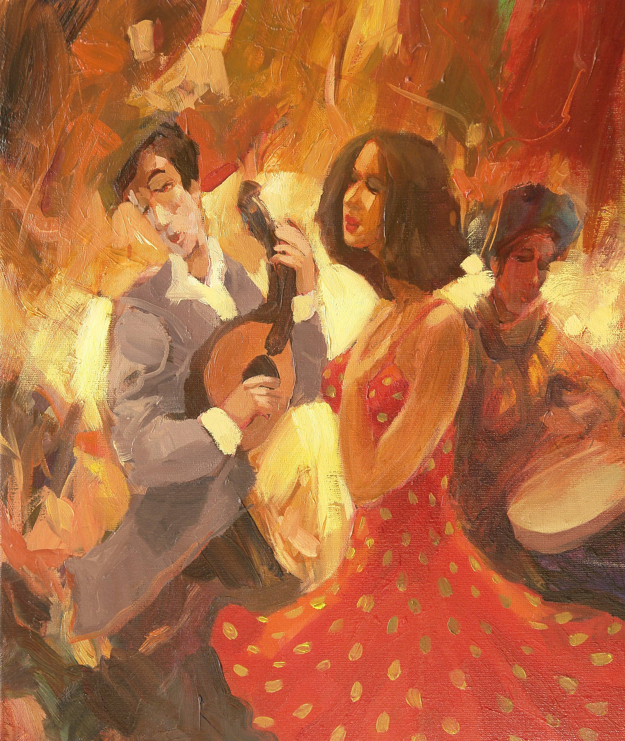 Obraz emanuje ciepłem dzięki dominującej palecie złocistych, pomarańczowych i czerwonych barw, które tworzą tło pełne energii. Postacie na płótnie ujęte są w dynamicznych pozach, a ich rozmyte kontury podkreślają ruch i ekspresję. Szczególnie przyciąga uwagę kobieta w czerwonej sukni w groszki, tańcząca z gracją, jakby porwana rytmem muzyki, którą czuje się wręcz w powietrzu. Obok niej gra mężczyzna z gitarą, jego skupienie widoczne na twarzy, choć artysta zrezygnował z drobiazgowego szczegółu, stawiając na ekspresjonistyczne pociągnięcia pędzla. Atmosfera obrazu jest pełna pasji i radości życia, niemal słychać dźwięki muzyki unoszące się w powietrzu. Styl artysty przypomina impresjonistyczne podejście do światła i cienia, co nadaje dziełu ulotny, "airy" charakter. Technika szerokich, swobodnych pociągnięć pędzla wzmaga uczucie ruchu. Obraz ten, dla niektórych, emanuje beztroską i wolnością, przywołując wspomnienia letnich wieczorów spędzonych wśród muzyki. Inni mogą poczuć tęsknotę za podróżą, za chwilą intensywnej radości zatrzymanej w czasie. "To jak na festynie!", pomyśli ktoś, kogo zachwyci ta feria barw i emocji. Dzieło jest jak zaproszenie do beztroskiego tańca, chwili zatrzymanej w przestrzeni między dźwiękiem a ruchomym światłem.
