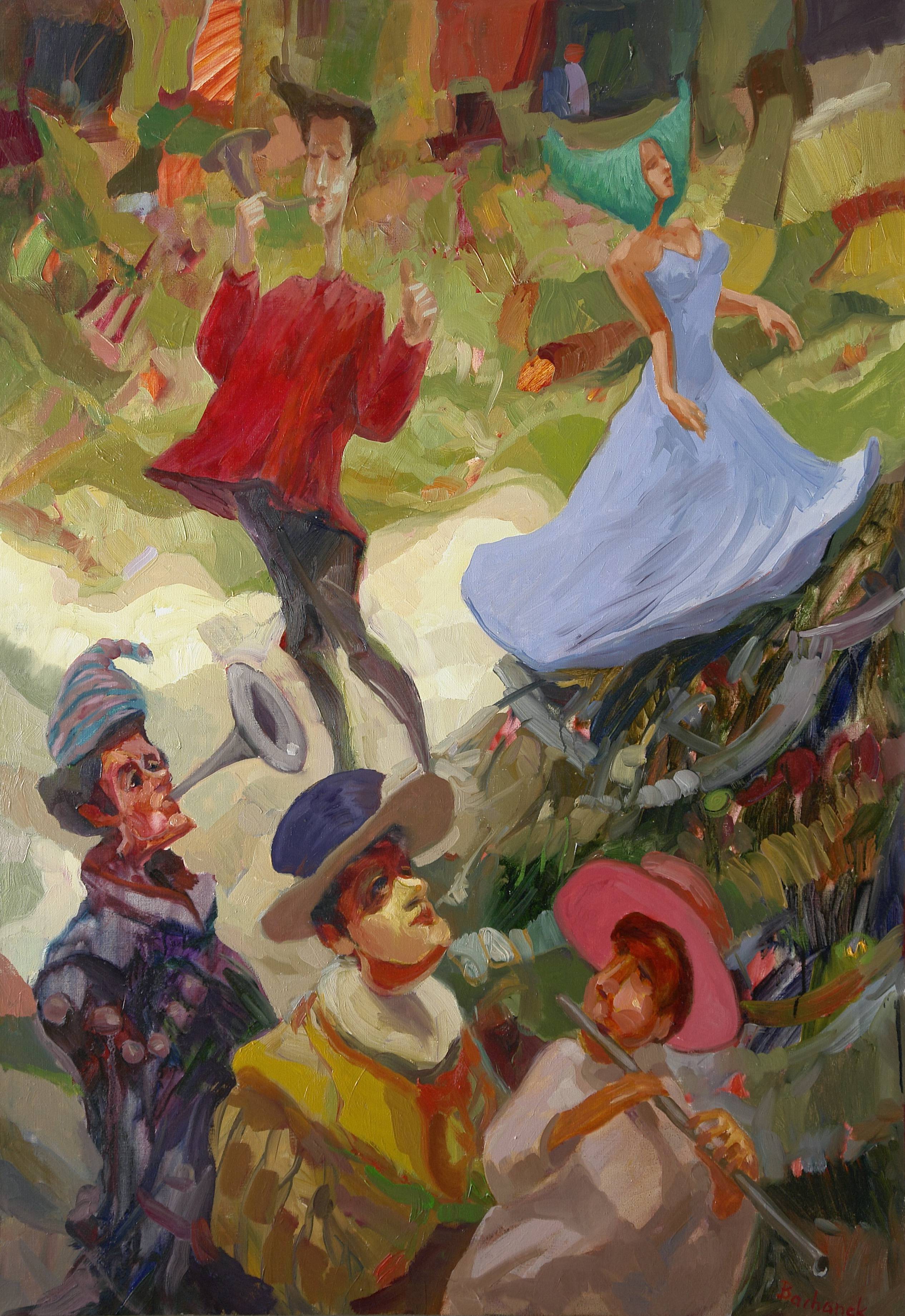 Obraz eksploduje feerią kolorów. Zielone i pomarańczowe plamy tworzą tło pełne dynamicznego ruchu. Centralną część zajmuje postać w jaskrawej czerwonej koszuli, utrzymująca balans na granicy ekspresji. Na pierwszy plan wysuwa się scena z muzykami w wielobarwnych strojach. Ich instrumenty zdają się śpiewać, a dźwięki wirują w powietrzu. Atmosfera to niekończący się festyn barw i form, trochę jak z baśni. Styl artysty przypomina impresjonizm, choć z nutką surrealizmu. Farby kładzione są zamaszystymi, pewnymi pociągnięciami pędzla, co dodaje całości energii. Obraz emanuje radością i lekką melancholią jednocześnie. Można dostrzec tu harmony między życiem codziennym a marzeniami. Dla 7-letniego dziecka to scena z bajki, gdzie wszyscy mają fajne kapelusze. Każdy detal obrazu przyciąga oko. It's magic! Odbiorca może poczuć się jakby uczestniczył w tanecznym korowodzie, gdzie wszystko jest możliwe. Zachwyt i nostalgia przeplatają się, tworząc unikalną mieszankę emocji.