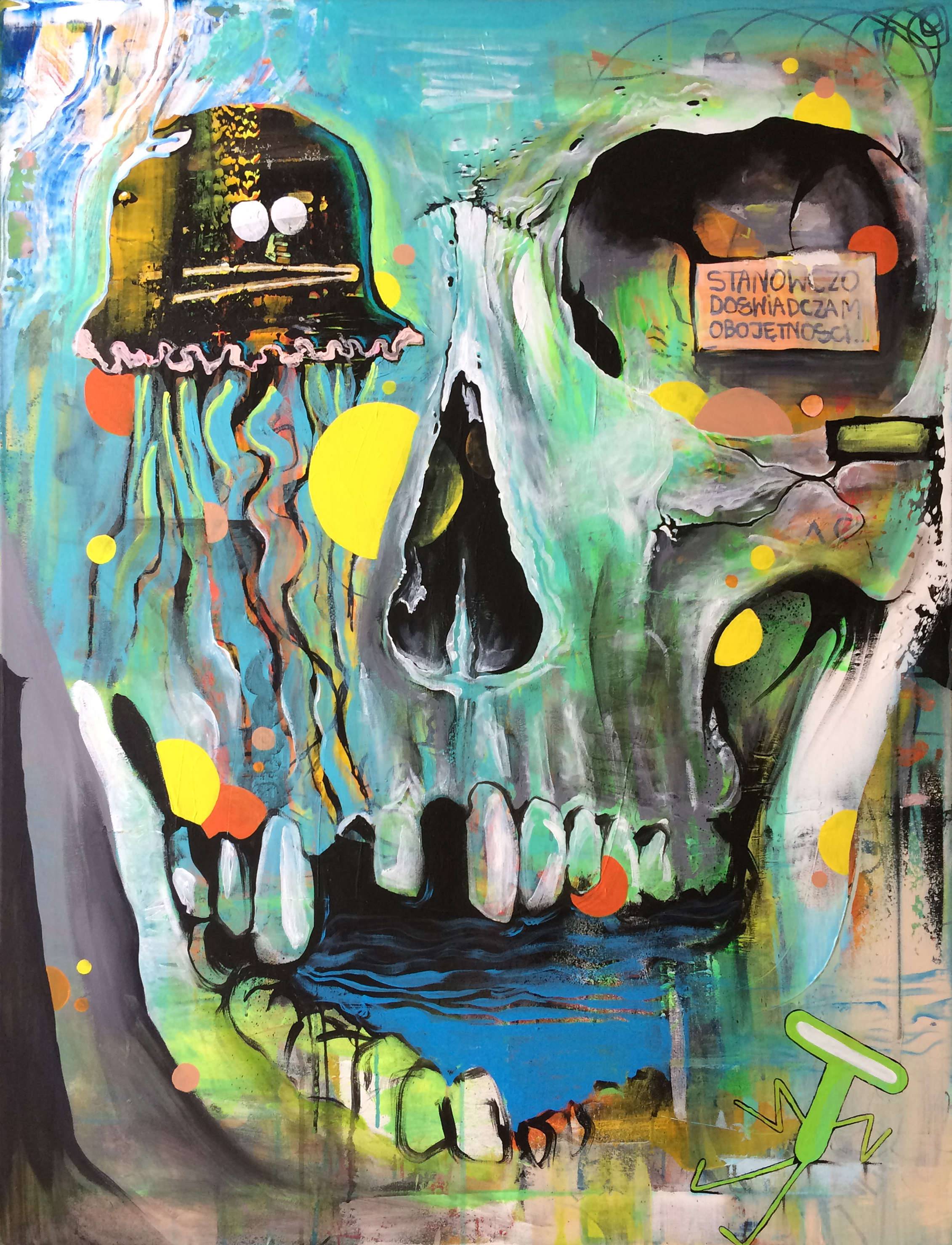 Obraz przyciąga wzrok intensywną paletą kolorów. Dominują błękity i zielenie, które tworzą tło dla surrealistycznej czaszki. Na pierwszy plan wysuwa się meduza o fluorescencyjnych barwach, unosząca się jakby w przestrzeni kosmicznej. Plamy żółci i pomarańczy rozświetlają kompozycję, nadając jej dynamicznego charakteru. Artysta zastosował techniques mieszania farb, co nadaje obrazowi głębi i tekstury. Nastrój dzieła jest nieco niepokojący, ale zarazem fascynujący. Czaszka wydaje się emanować tajemnicą i ciszą, które zmuszają do refleksji nad obojętnością, jaką widać na napisie. Czasami czuję się tak zagubiony jak dziecko, które zgubiło ulubioną zabawkę. Obraz jest jak sen, trochę dziwny, ale niezwykle intrygujący. Może budzić emocje zarówno lęku, jak i ciekawości. A może nawet przypominać o kruchości życia. To dzieło jest naprawdę captivating, pochłania całą uwagę, zmuszając do zastanowienia się nad esencją ludzkiej egzystencji.