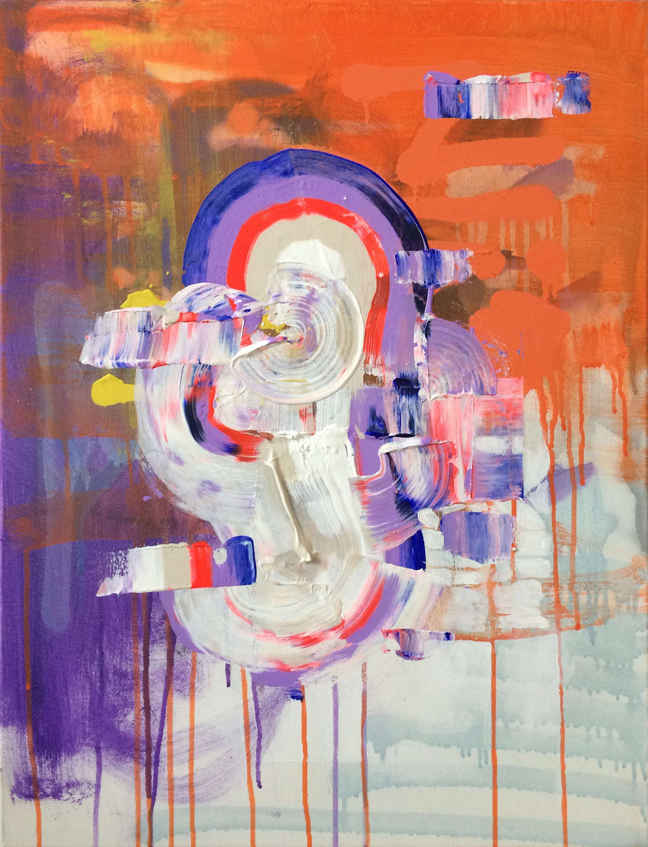 Na obrazie dominuje eksplozja kolorów, a przede wszystkim pomarańcz przeplatający się z fioletem i bielą. Kształty są dynamiczne, jakby malowane szybkim ruchem pędzla, dając wrażenie spontaniczności. Na środku widnieje abstrakcyjna, spiralna forma, której towarzyszą różnokolorowe plamy. Całość zdaje się drgać, jakby ożywiana niewidzialną energią. Może to przypominać chaos, ale taki artystyczny chaos, który ma swój własny "flow". Obraz emanuje radośnie-chaotycznym nastrojem, łączy w sobie elementy niepokoju i twórczej swobody. Artysta korzysta z grubo nałożonej farby, co dodaje dziełu tekstury i głębi. Technika jest zdecydowanie abstrakcyjna, a dzieło przywodzi na myśl nowoczesnego Pollocka. Obraz wywołuje mieszankę emocji. Można poczuć radość, energię, ale i pewien niepokój związany z nieuporządkowaną kompozycją. Może się nawet zastanawiasz, co artysta miał na myśli – ale to właśnie magia abstrakcji. It's like a visual dance. Dla 7-letniego dziecka: "Ten obraz jest fajny, pełen kolorowych plam i wygląda jak wielki wir!" Każdy patrzy i widzi co innego, a to jest takie magiczne. W sumie, przypomina mi trochę burzę na niebie. Razem z tymi kolorami dzieło staje się nie tylko wizualną ucztą, ale i emocjonalnym doświadczeniem.