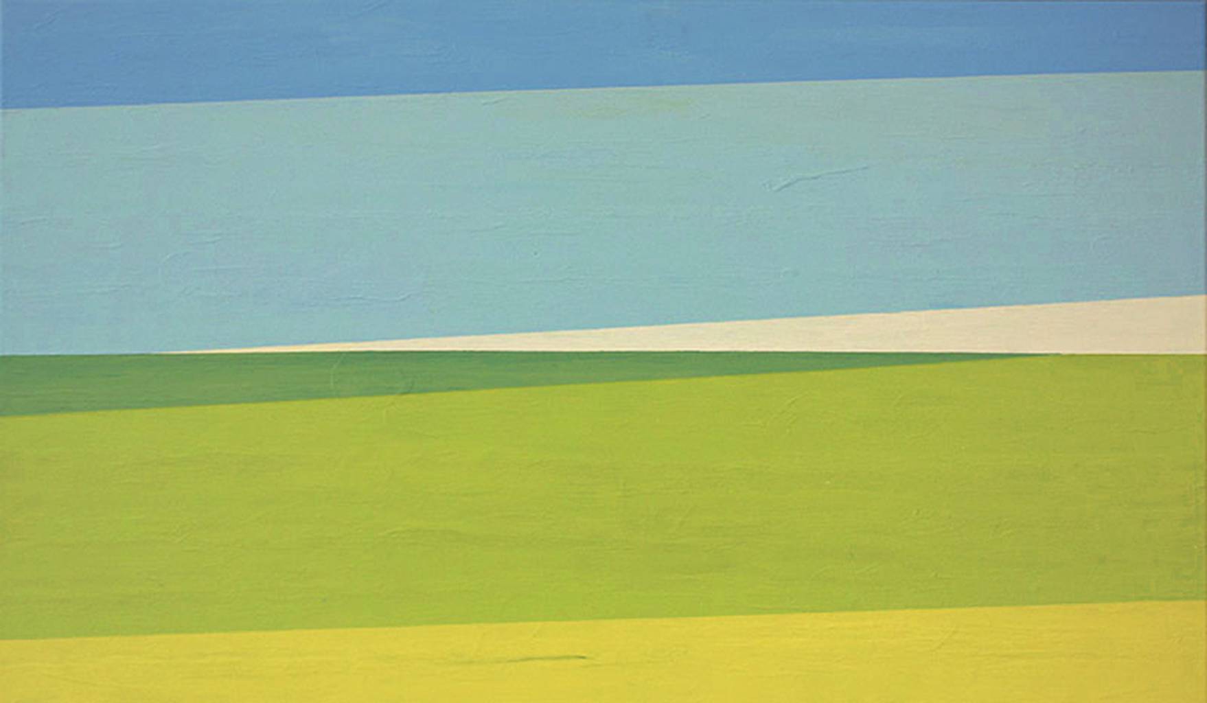 Obraz jest jak kawałek nieba i ziemi ujęty w prostą symfonię kształtów i kolorów. Widać tutaj odcienie błękitu przechodzące w delikatne zielenie, które przywodzą na myśl spokojne dni na łonie natury. Kompozycja składa się z poziomych pasów, które spokojnie biegną przez płótno, jakby były niczym więcej jak horyzontem. Ten minimalizm jest tak wyrazisty, że aż czuć, jak całe to dzieło mówi "relax" i pozwala odetchnąć od zgiełku codzienności. Atmosfera obrazu jest pełna spokoju i harmonie. Wydaje się, że czas płynie wolniej, a natura otacza swoim kojącym uściskiem. Artystyczny styl jest czystość sama w sobie, przypominający estetykę abstrakcyjnych krajobrazów. Użycie płaskich plam koloru i brak detali tworzą przestrzeń otwartą na interpretacje. Dla mnie, to jak sen o beztroskim dzieciństwie, kiedy to człowiek po prostu leży na trawie i wpatruje się w niebo. „Niebo jest niebieskie, a trawa zielona” - powiedziałoby dziecko na widok tego obrazu. Emocjonalny odbiór to mieszanka nostalgii i radości; może też uczucie lekkiego zagubienia w czasie. Idealne dla tych, co szukają chwili spokoju w artystycznym wyrazie. To trochę jak marzenie, które możesz dotknąć, tylko po to, by zrozumieć jak ulotne jest.
