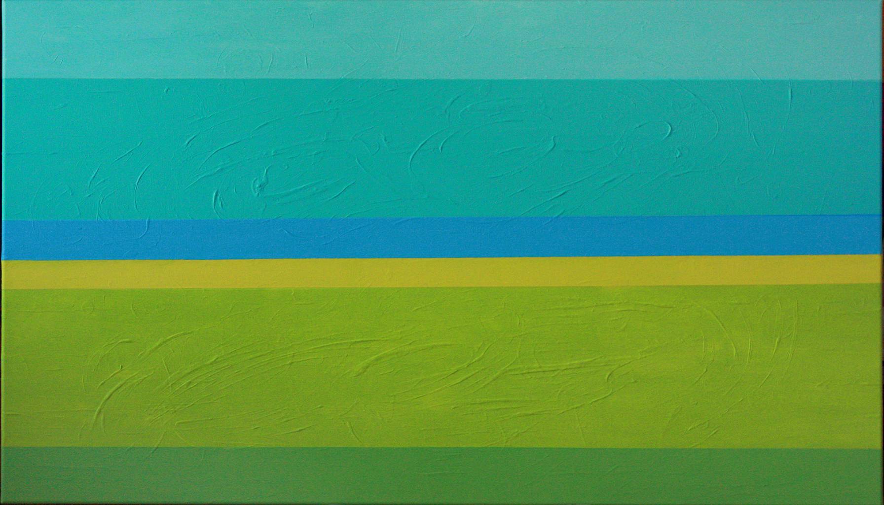 Obraz przedstawia kompozycję poziomych pasów, które toną w błękitach, zieleniach i odcieniach żółci. Każdy pasek jest inny jak niebo, morze i ziemia spotykają się w jednym punkcie. Kolory są żywe, choć subtelne, z delikatnymi fakturami malarskimi, które dodają głębi całości. Atmosfera emanuje spokojem i harmonią, przypominając letni dzień na plaży gdzie morze szepcze swoje opowieści. Styl artystyczny to czysta abstrakcja, która pozwala odbiorcy na własną interpretację. Pociągnięcia pędzla są równomierne, a stosowane techniki maskują ślady emocji, które artysta ukrył pod warstwami farb. Dziecko powiedziałoby: Te kolory wyglądają jak moje kredki. Obraz sprawia, że czuję się wewnętrznie błogo, a jednocześnie czuję ten nieodparty urge, aby rzucić wszystko i polecieć nad morze. Każdy pasek wydaje się być symbolicznym odzwierciedleniem różnych stanów emocjonalnych – od spokoju po radość. Pomyśl o "calmness" – właśnie to zawiera w sobie ta kompozycja. Interpretacja tego dzieła jest subiektywna i otwiera szerokie pole do refleksji. Czy to metafora życia, które układa się warstwa po warstwie? Może to tylko gra kolorów, pozostawiająca odbiorcę z własnymi myślami. Każdy znajdzie tu coś dla siebie, a prosta struktura pozwala umysłowi swobodnie wędrować.