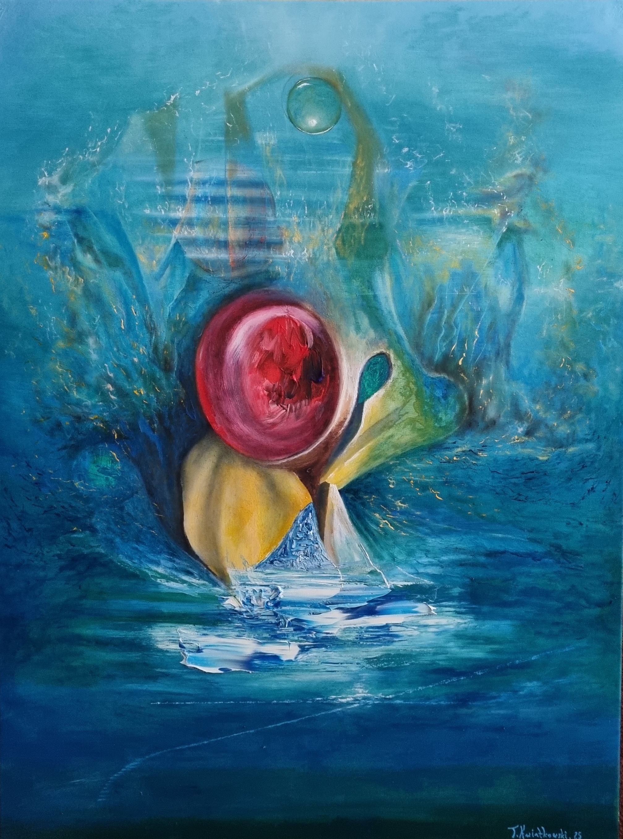 Obraz tonie w chłodnych błękitach i turkusach, jakby ktoś rozlał po płótnie morze i lekko je rozsmarował. W centrum siedzi wielka czerwona kula, soczysta i ciężka, otulona mlecznymi smugami i zielonkawym łukiem, a niżej żółtawy kształt i białe, poszarpane plamy przypominają lód na wodzie. Kompozycja wiruje do środka, trochę chaos, trochę porządek. Atmosfera jest senna, ale nie do końca spokojna, czuć napięcie jak przed burzą. Technika wygląda na mieszankę laserunków i energicznych pociągnięć, z drobnymi zachlapaniami złota. Patrzę i mam wrażenie, że to opowieść o zanurzaniu się w pamięć, takie dream w niebieskim. To jest wielka czerwona piłka i ona świeci. I serio, robi mi się trochę smutno, a za chwilę dziwnie lekko, no bo może to jednak narodziny czegoś nowego.