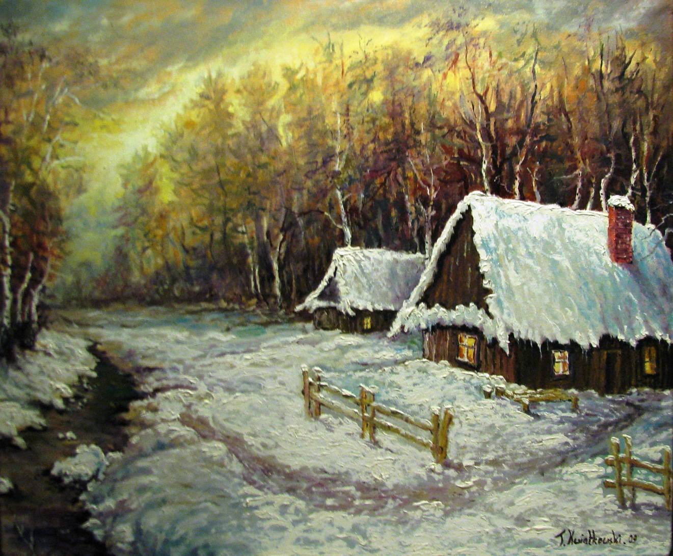 Pełnia zimy. Gdzieś na pustkowiu mieszka wielodzietna rodzina. Światło w oknach chaty i wieczorowa pora może świadczyć o tym, że właśnie domownicy szykują się do kolacji. Wartko płynący strumień omija tę samotnię i kieruje się w głąb lasu.