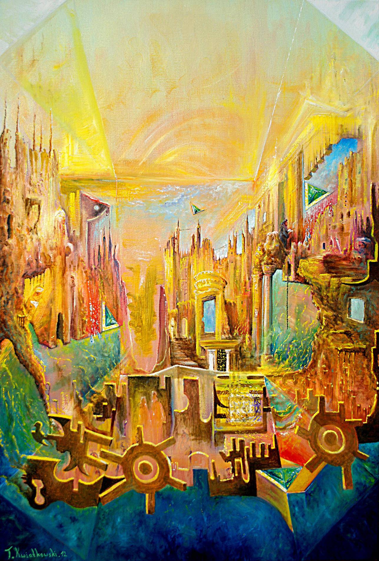 Widzimy surrealistyczny świat, w którym dominuje żółty kolor. Może to być jakieś baśniowe miasto, a może po prostu, najzwyczajniej w świecie tak wygląda… kanarek od środka.