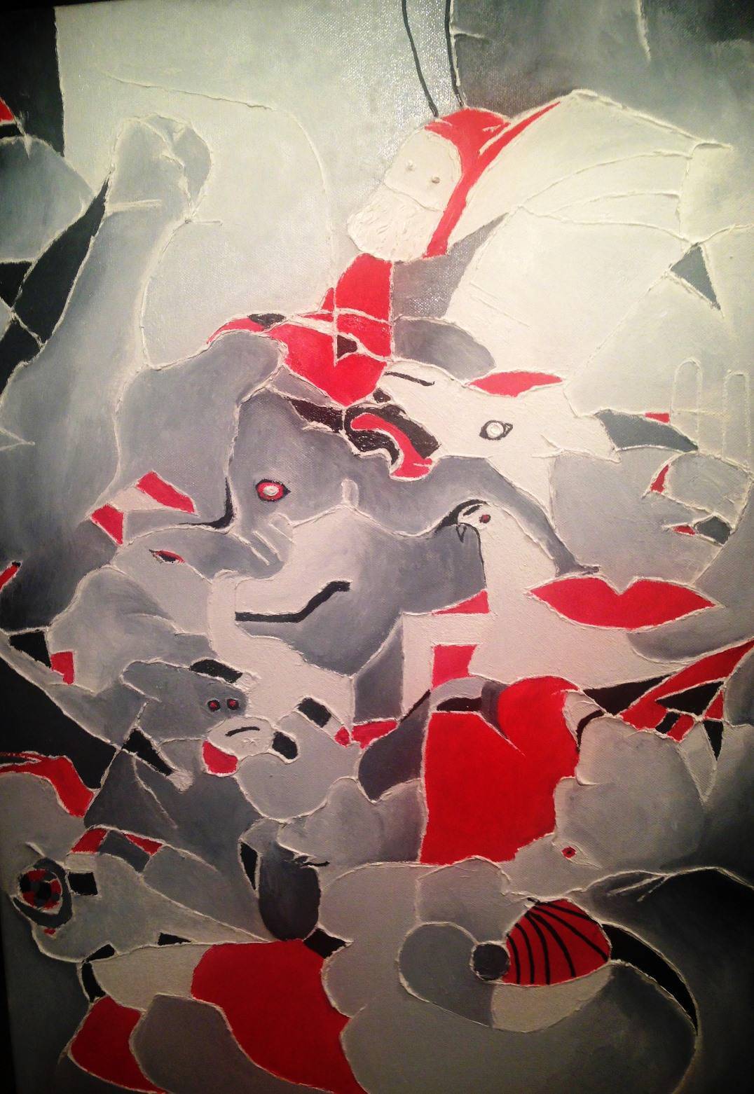 Obraz emanuje tajemniczością i nieco abstrakcyjnym klimatem. Przewaga szarości, czerni i bieli przeplatanej czerwonymi plamami tworzy zaskakujący kontrast. Kompozycja jest dość chaotyczna, lecz ma w sobie pewną harmonijną dynamikę. Elementy przypominające zwierzęta i postacie ludzkie mieszają się ze sobą. Można powiedzieć, że obraz emanuje pewną „wild” energią, powodującą, że trudno od niego oderwać wzrok. Styl artysty jest zdecydowanie nowoczesny. Użyto tutaj technik typowych dla abstrakcji - wyraźne, płaskie plamy koloru oddzielone od siebie konturem tworzącym wyraziste granice. Obserwując to dzieło, łatwo jest popaść w zadumę. Odbiorca może poczuć nostalgię albo niepokój, gdyż obraz balansuje na granicy między rozpoznawalnością a abstrakcją. To niczym bajka opowiedziana w inny sposób. Znajdziesz tu dziwne stwory, które mogą być kimkolwiek sobie wymarzysz! Czuję, że artysta chciał zachęcić do otwartego myślenia oraz własnych interpretacji. Ten obraz to idealne pole do osobistych refleksji, a może nawet początku rozmowy o tym, co zobaczone, a niewidoczne. Niesamowita mieszanka barw i form daje poczucie, że coś się stało lub dopiero się wydarzy. Światło i cień igrają między sobą, tworząc niezwykły spektakl emocji.