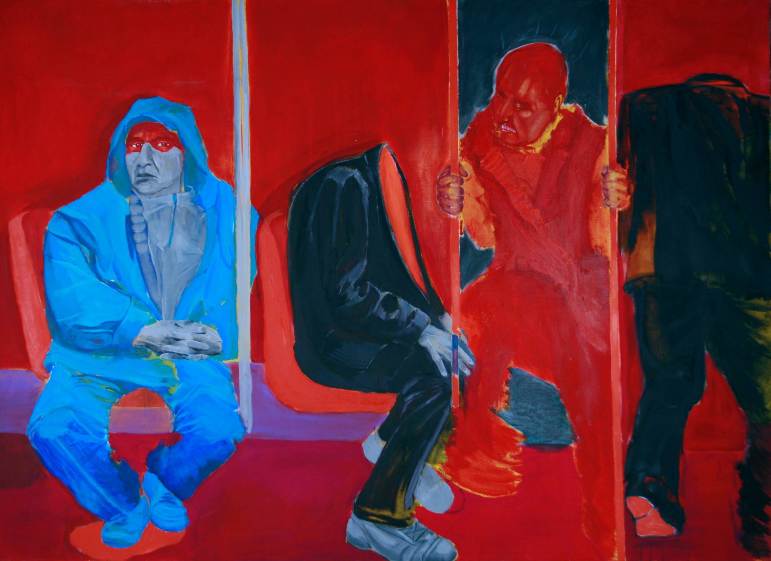 Obraz jest niezwykle intensywny, zdominowany przez żywe kolory: głęboki czerwony, niebieski i pomarańczowy. Centralnym punktem jest postać w jaskrawym, niebieskim płaszczu, kontrastującym z krwistoczerwonym tłem. Kompozycja obrazu jest dość klaustrofobiczna. Poczucie zamknięcia potęgowane jest przez ciasno rozmieszczone figury, zdające się być zamknięte we własnych, odrębnych światach. Styl malarski jest swobodny, z dynamicznymi pociągnięciami pędzla, które dodają dramatyzmu. Dzieło emanuje niepokojem i napięciem, wprawiając widza w stan refleksji nad alienacją i samotnością. Można poczuć się jak w zatłoczonym subway, pełnym emocji i ludzkich trudów. Patrząc na obraz, zastanawiamy się: co myślą te osoby? W mojej głowie koi myśl, że każdy ma swoją własną, osobistą historię. Dziecięce zdanie mogłoby brzmieć: „Ludzie na rysunku są smutni”. Technika użyta przez artystę jest odważna, wręcz brutalna w swoim przekazie. Emocje bijące z tego dzieła skłaniają do głębszej analizy, zmuszają do zadumy, pozostawiając niepokój i ciekawość. Skany kolorów i nastrojów są, mówiąc potocznie, totalnie "in your face", co sprawia, że obraz długo pozostaje w pamięci.