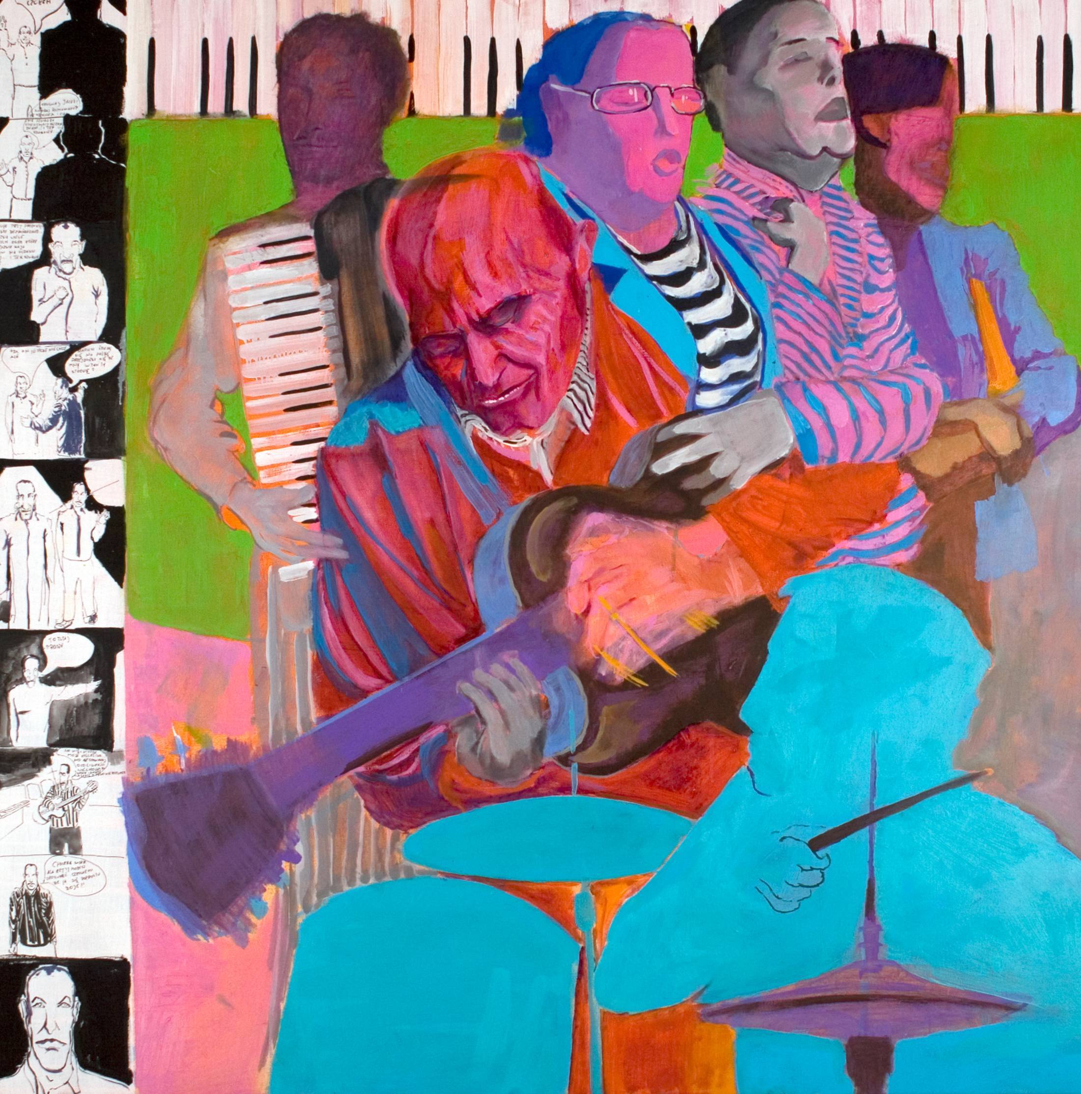 Obraz emanuje żywymi kolorami, które przyciągają wzrok i sprawiają, że chcesz się na nim skupić na dłużej. Czerwone, różowe i fioletowe odcienie twarzy postaci nadają im nieco surrealistyczny wygląd, podczas gdy zielone tło kontrastuje z ich intensywnością. Kompozycja jest dynamiczna, z postaciami ustawionymi w równoległych liniach, co przywodzi na myśl muzyczny ensemble. Atmosfera obrazu jest pełna energii, jakby scena właśnie tętniła muzyką i rytmem. Styl artystyczny jest odważny, z grubymi pociągnięciami pędzla i śmiałymi konturami, które nadają mu ekspresyjny charakter. Z boku obrazu widać czarno-białe komiksowe kadry, dodające nuty humoru i historii. Obraz może wywoływać u odbiorcy poczucie nostalgii za minionymi czasami, kiedy muzyka była sercem towarzyskich spotkań. Albo wręcz przeciwnie, może wzbudzić chęć uczestniczenia w takim momencie tu i teraz. Dla mnie, widząc takie połączenie barw i form, czuję jakbym słyszał echo dawnej melodii. Wow, it's so lively! Jakby ktoś opowiadał historię muzyki za pomocą farb. Dzieciak powiedziałby: "Patrz, pan gra na gitarze tak mocno, że aż kolory się pomieszały!". To dzieło potrafi zatrzymać na chwilę w biegu codzienności i przenieść w świat dźwięków i wibracji.