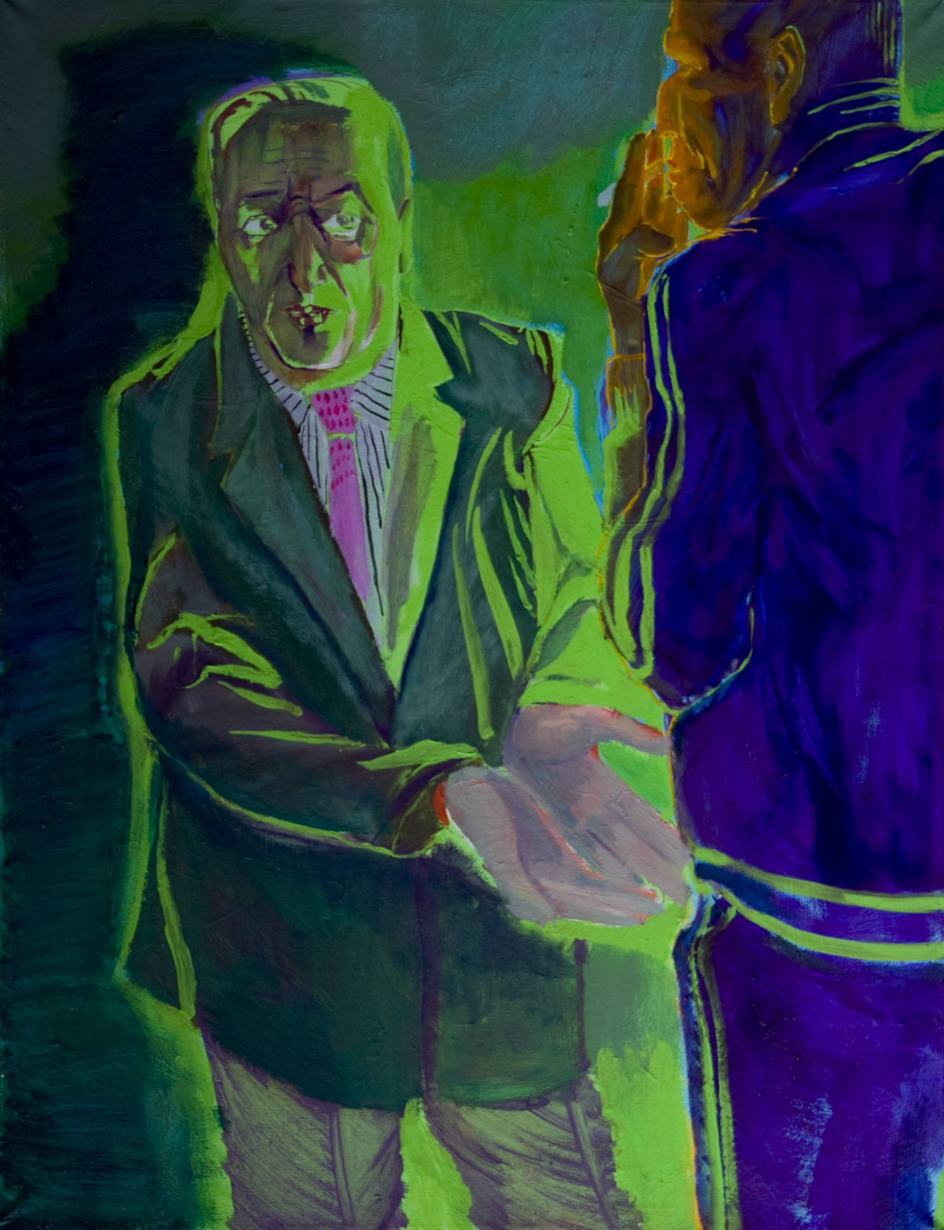 Na tym obrazku zauważamy intensywną grę barw. Silne, fluorescencyjne zielenie przeplatają się z głębokimi purpurami. Te kolory tworzą kontrast, który od razu przyciąga uwagę. Postacie są ułożone centralnie, jedna z nich ma gest, jakby coś proponowała. Kompozycja jest dynamiczna, pełna ruchu, mimo że obrazuje statyczną scenę. Nastrój obrazu można opisać jako tajemniczy i trochę niepokojący. A może jednak nie. Jest w nim coś intrygującego, co sprawia, że chcemy wiedzieć więcej. Styl artystyczny sugeruje zainteresowanie surrealizmem, jednak technika jest bardzo nowoczesna, prawie jakby artysta bawił się digital painting. Linia jest swobodna i bez reguł, co nadaje pracom bardzo expressive vibe. Zresztą, kto by nie lubił trochę szaleństwa w sztuce? Wyobrażam sobie, że obraz może budzić różnorodne emocje. Ktoś poczuje niepokój, a ktoś inny może uznać go za zabawny, gdyż jest w nim coś komicznego. Myślę, że taki obraz mógłby przenieść mnie do innego świata, gdzie wszystko jest dziwaczne i fascynujące. Jakby postacie opowiadały sobie historię w tajemnicy, od której świat zależy. "To wygląda jak światło neonowe w nocy!" – mogłoby powiedzieć 7-letnie dziecko, zauważając kolorystykę. Co do mnie, to czuję, jakby obrał mnie w magiczny kokon koloru i tajemnicy, pełen pytań i niedopowiedzeń.