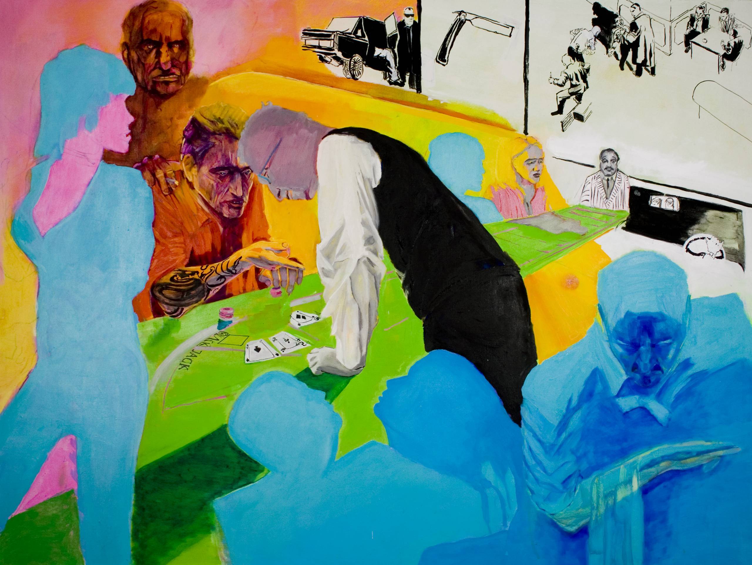 Obraz emanuje intensywnością kolorów i dynamiczną kompozycją, gdzie turkusowe i różowe sylwetki kontrastują z żółtym tłem. Centralnie umieszczony stół do blackjacka przyciąga wzrok, a postacie wokół niego zdają się owiane jakąś tajemnicą. Atmosfera jest nerwowa, jakby wszyscy zebrani mieli coś do ukrycia, a napięcie można niemal "cut with a knife". Styl artysty jest niepowtarzalny, z widocznymi wpływami pop-art i surrealizmu, co podkreśla wrażenie złożoności sceny. Emocje, które towarzyszą odbiorcy, to mieszanka ciekawości i niepokoju. Obraz może uruchomić wyobraźnię, przypominając o skomplikowanej naturze ludzkich relacji. Na marginesie, spostrzeżenie dziecka: "Jedna pani ma kolorową twarz jak chmura z waty!", pokazuje niewinną fascynację złożonymi detalami. Całość ma w sobie coś z nieoczekiwanej historii, którą każdy może zinterpretować na swój sposób. Moje osobiste odczucie? Trochę jak w kinie - nigdy nie wiesz, co się zaraz wydarzy.