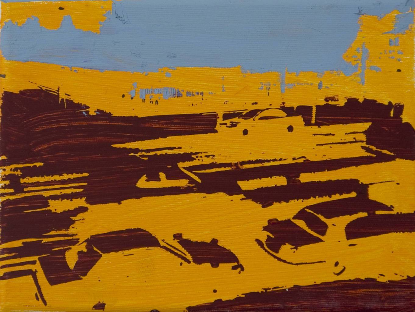 Na obrazie dominują ciepłe barwy żółci i brązu kontrastujące z bladym błękitem. Przewaga poziomych linii sugeruje coś industrialnego, może parking lub ulice pełne aut. Wszystko wygląda jakby zrobione było w stylu techniki reliefu, z wyraźnymi kształtami i konturami. Nastrój? Trochę tajemniczy. Wydaje się, że czas zatrzymał się w miejskim zgiełku, a statyczność zaprasza do refleksji. Obraz może wywołać u odbiorcy sentyment do więzów miejskich, gdzie dynamika zderza się ze spokojem chwili. Styl jest minimalistyczny, a jednocześnie pełen emocji. Prostota wykonania przyciąga wzrok, zachęcając do zgłębienia detali. "Wow, samochody jak klocki LEGO!" - powiedziałoby dziecko, widząc te geometryczne kształty. Gdy patrzę na to dzieło, czuję jak artysta bawi się przestrzenią i kolorem, tworząc niesamowity efekt głębi. Zdaje się, że można tu odkryć fragmenty codzienności. Trochę to surrealne, a zarazem "beautiful". Obraz jednocześnie przyciąga i każe się zatrzymać.