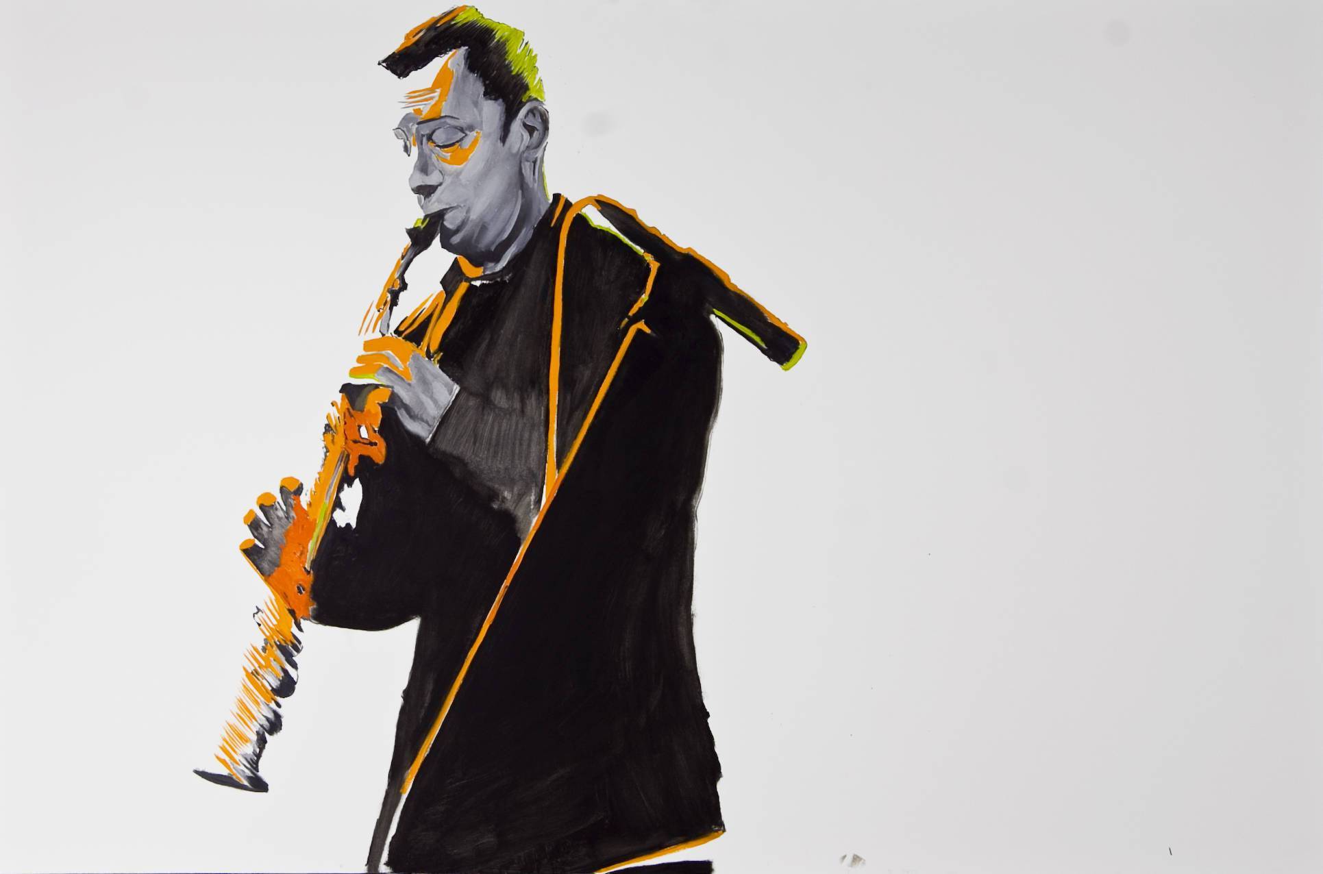 Obraz przedstawia muzyka zanurzonego w grze na klarnecie. Dominują kontrasty czerni i pomarańczu na białym tle, co nadaje dziełu dynamiczną głębię. Postać jest częściowo realistyczna, ale ma też elementy stylizowane. Czarny strój niemal zlewa się z tłem, a pomarańczowe akcenty podkreślają energię muzyki, jakby dźwięki wydobywały się z instrumentu i płynęły wokół. Atmosfera tego artworks jest pełna melancholii, z lekką nutką tajemniczości. Technika artystyczna jest odważna, z wyraźnymi pociągnięciami pędzla. Ta odrobina chaotyczności nadaje autentyczności, jak jazzowa improwizacja. Czuję, że ktoś może poczuć inspirację lub nawet tęsknotę. Czy nie jest tak, że każdy z nas ma swój wewnętrzny jazz? Ciekawe, jak różni odbiorcy mogą interpretować ten obraz, niektórzy mogą zobaczyć tu spokój, inni pasję. Może mały chłopiec powiedziałby: "Muzyk gra pięknie jak w bajce!" To nie jest tylko portret, to wizualna symfonia kolorów i emocji.