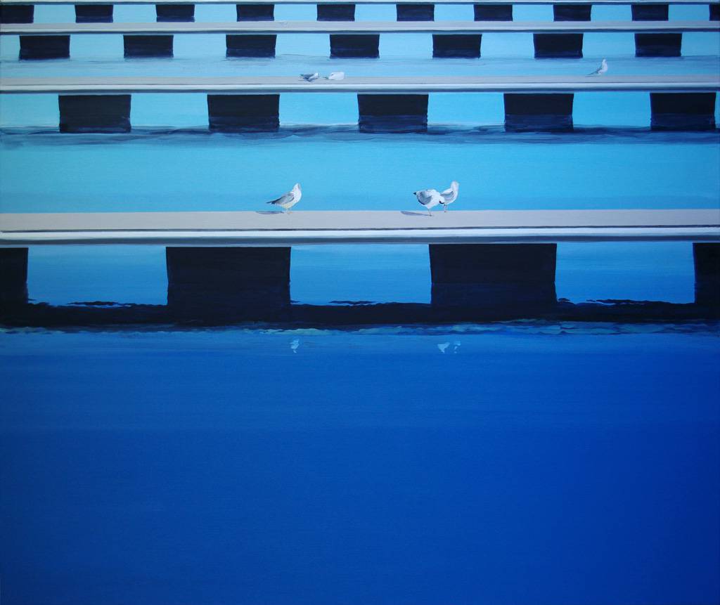 Na tym obrazie dominują odcienie niebieskiego, które spokojnie rozwijają się w różnych tonacjach aż do horyzontu. Rząd białych linii przecina powierzchnię, tworząc rytmiczne wzory, a gdzieniegdzie widać kilka ptaków, które wyglądają jakby tańczyły na tafli wody. Kompozycja obrazu jest bardzo uporządkowana, co nadaje całości wrażenie spokojnej symetrii. Jednak, kiedy się dokładnie przyjrzeć, dostrzegamy delikatny ruch i grę cieni, tak jakby ptaki sam na tropikalnej plaży. Atmosfera tego dzieła jest nostalgic, ale jednocześnie świeża i pełna przestrzenii. Elementy minimalistyczne, czasem pozostawiają puste miejsca, które wywołują uczucie odprężenia u odbiorcy. To trochę jak patrzenie na nieskończony ocean, który kryje mnóstwo tajemnic. Technika artystyczna jest subtelna i precyzyjna, z delikatnymi przejściami kolorystycznymi, co dodaje głębi i dynamizmu. Obraz budzi refleksję nad spokojem i uporządkowaniem życia. Tak sobie myślę, że czuć tu pewien „flow”, które wciąga jak fale. A ta mewa wygląda, jakby chciała zatańczyć! To bardzo osobiste wrażenie, gdy pomyślę o tym, co daje mi uczucie wolności i spokoju. W końcu czasem małe chwile w życiu mogą być najbardziej magiczne. Takie obrazy przynoszą mi wspomnienia z wakacji, gdy siedziałem na brzegu morza i patrzyłem jak fale tańczą z piaskiem. I ptaki przelatują nad głowami. Szczerze powiedziawszy, ten obraz to prawdziwy „peaceful chaos”!