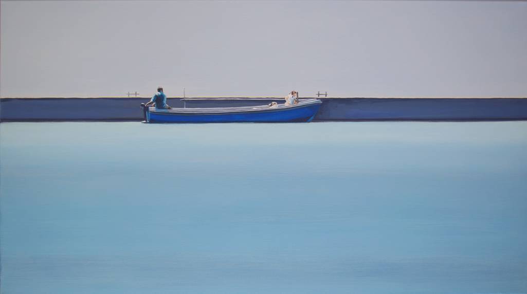 Obraz przedstawia minimalistyczną kompozycję, w której dominuje chłodny błękit rozlewający się po powierzchni wody i nieba. Na pierwszy plan wysuwa się niewielka łódź w intensywnym odcieniu niebieskiego, subtelnie kontrastująca z monolitycznym murem w tle. Dwie postacie na łodzi zdają się być zanurzone w chwili ciszy, spędzając czas na spokojnych wodach, co tworzy atmosferę spokoju i wyciszenia. Artysta posługuje się techniką malarstwa realistycznego, a jednocześnie operuje prostotą form. Minimalizm kompozycji i redukcja detali sprawiają, że obraz emanuje uczuciem bezkresu i niewielkości człowieka wobec natury. Te proste, geometryczne linie i jednolite płaszczyzny koloru wprowadzają element nowoczesności. Dzięki tej harmonijnej kolorystyce i formie, obraz może budzić u odbiorcy poczucie nostalgii i tęsknoty za chwilami zapomnienia. Dzieciak mógłby powiedzieć, że ta łódka jest jak ptak na dużej kałuży w parku. Patrząc na to dzieło, czujemy spokój, a jednocześnie peculiar kind of longing. To przypomnienie, że czasami wystarczy moment zadumy, aby odnaleźć wewnętrzny balans.