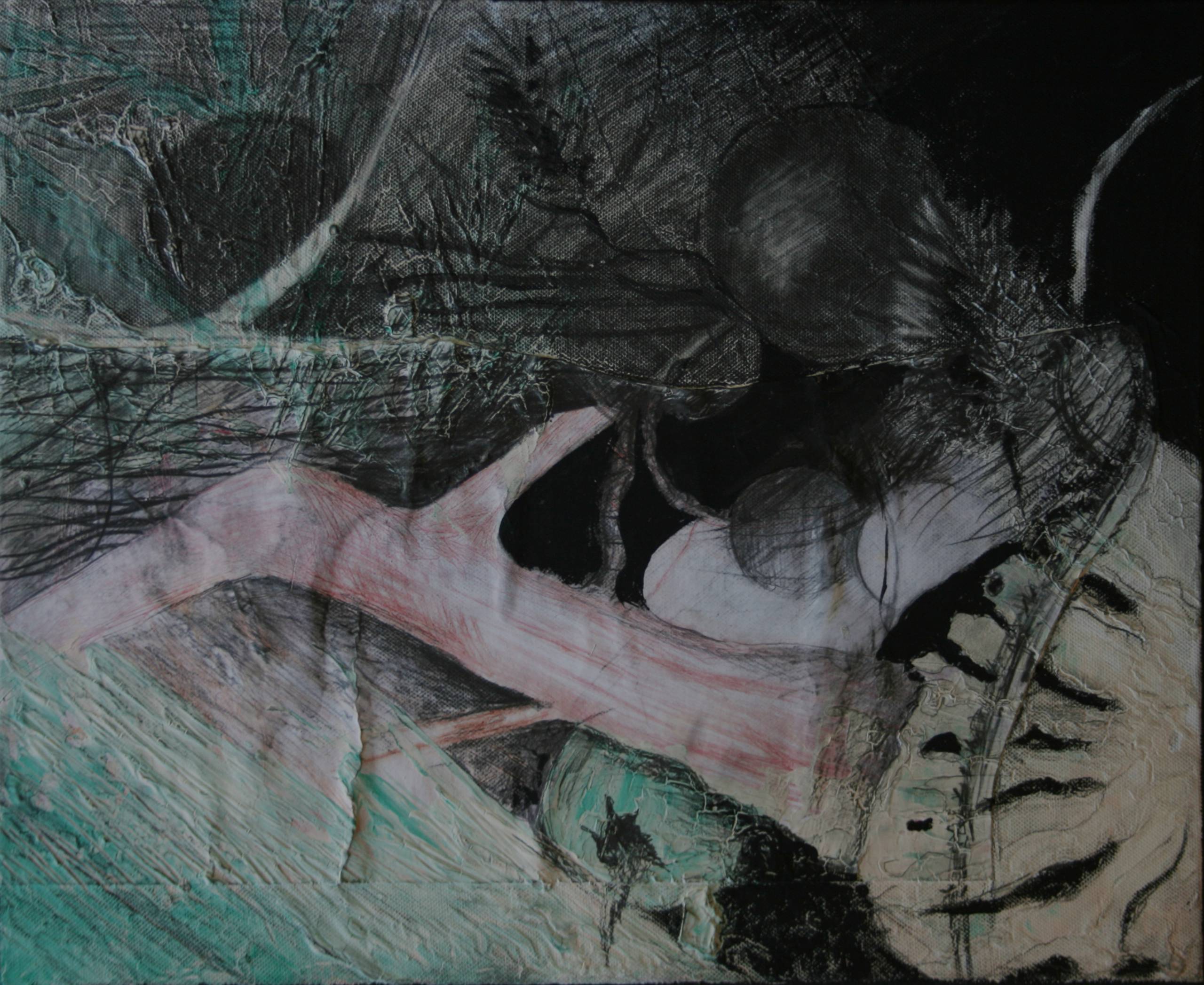 Ten obraz to prawdziwy rollercoaster dla oczu. Dominuje tu paleta zimnych odcieni: szarości, czerni i subtelnej zieleni, co tworzy nietypową i nieco tajemniczą aurę. Na pierwszy rzut oka uwagę przyciągają wirujące kształty, które układają się w abstrakcyjne formy. Czy oko, czy może gałąź? Kompozycja jest złożona, pełna faktur, które dodają głębi i dynamiki. Artysta posłużył się techniką kolażu, cudownie mieszając elementy rysunku z malarstwem. Tak mi się wydaje, że to jak ptak, który lata w burzy. Atmosfera jest jakby melancholijna, przywodzi na myśl mroczne sny, z odrobiną enchanted dotknięcia tajemnicy. Styl jest dynamiczny, raczej ekspresyjny, niemal jak z nurtu surrealizmu. Obraz może wywołać emocje niepokoju, ale i fascynacji. To arcydzieło może zrodzić wiele interpretacji: od chaosu myśli po nieznaną siłę natury. Dream-like, to jedno słowo, które przychodzi na myśl, owijając całość w tajemniczy płaszcz. A ty, co widzisz na tym obrazie? Bo ja widzę świat pełen magii.
