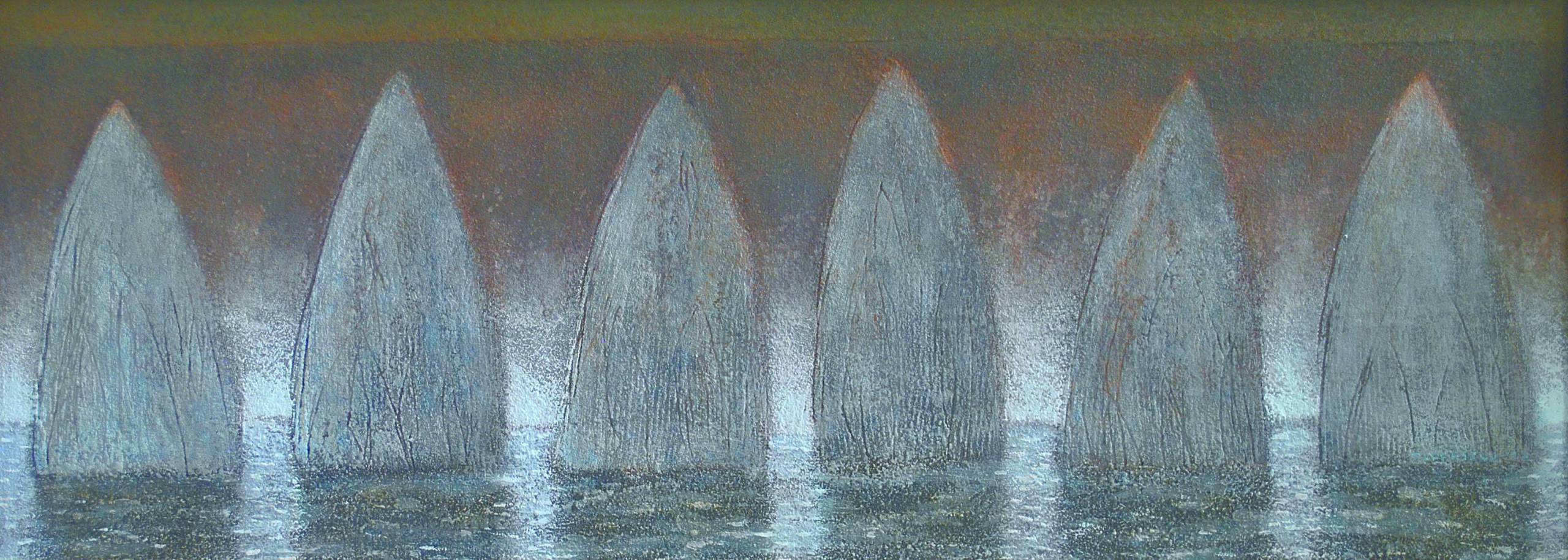 Obraz przedstawia sześć smukłych kształtów przypominających żagle, które dumnie wznoszą się nad poruszoną taflą wody. Kolory są stonowane, dominują odcienie szarości i niebieskości, które subtelnie przechodzą w beżowe i brązowe tło. Kompozycja jest symetryczna i uporządkowana, a miękko rozmyte kształty dodają jej tajemniczej aury. Atmosfera dzieła jest nieco melancholijna, a jednocześnie emanuje spokojem, jakby zapraszała do chwili refleksji. Artysta skorzystał z techniki impasto, co dodaje obrazowi teksturę i głębię. Obraz intryguje i zachęca do interpretacji. Czy żagle symbolizują podróż, poszukiwanie nowych horyzontów? Może to metafora ulotności chwil, które przemykają, jak statki na horyzoncie. "To jest obraz z kocem" — powiedziałby może siedmiolatek. Bezpretensjonalne stwierdzenie, które ma swój urok. Dzieło jest jak "whisper" morskiego wiatru, delikatne i niedopowiedziane. Obserwator może poczuć, że zagłębia się w coś bardziej osobistego, coś, co przekracza pierwszy rzut oka. To obraz, który można oglądać bez końca, za każdym razem odkrywając coś nowego.