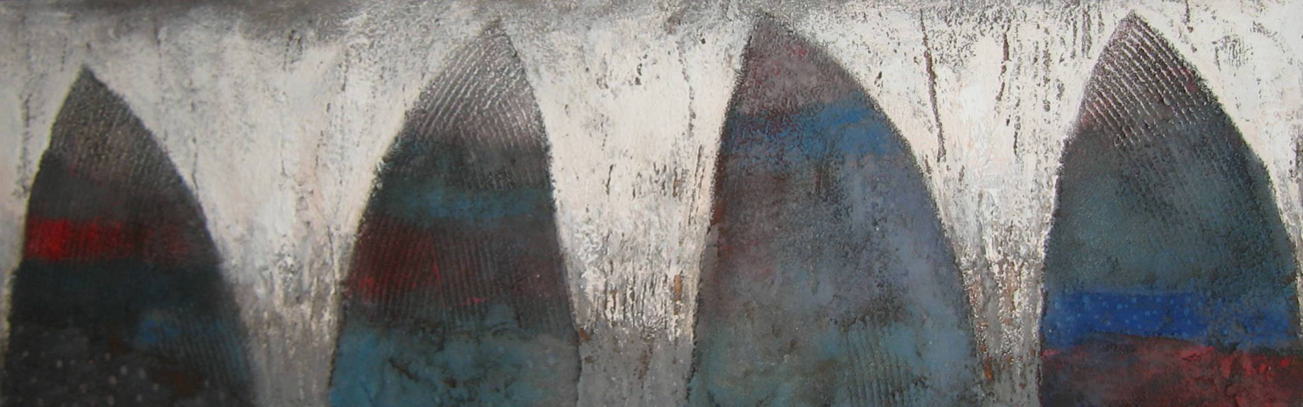 Na tym obrazie dominują tajemnicze łukowate kształty, przypominające gotyckie wrota. Kolory są stonowane i chłodne, z przewagą szarości, błękitu oraz przydymionej czerwieni. Kompozycja jest symetryczna, co nadaje dziełu harmonii i spokoju, ale jednocześnie buduje pewną tajemniczość, której nie sposób zignorować. Tło jest surowe i teksturowane, jakby artysta malował na starej, chropowatej ścianie. To sprawia, że całość wydaje się być relictem z odległej przeszłości. Atmosfera obrazu jest melancholijna, jakby przenosiła nas do miejsca pełnego wspomnień i zagadek. Użyte techniki artystyczne wskazują na mieszankę impasto i delikatnych ruchów pędzlem, co dodaje struktury i głębi. Odbiorca może poczuć się jak odkrywca, który stara się rozwikłać znaczenie tych tajemniczych form. Moje pierwsze skojarzenie? To takie jakby ukryte story, które czeka na odkrycie. Jak patrzę na te łuki, myślę sobie, że to takie "wow", takie nieco eerie, jak w filmie. Co by powiedziało dziecko? Może stwierdziłoby: "To wygląda jak wielkie drzwi do zamku ducha". Obraz z pewnością wzbudza emocje, od ciekawości po pewien niepokój. To takie dzieło, co wywołuje uśmiech z nutką mystery na twarzy i sprawia, że rozmyślasz nad tym, co właśnie widzisz. Fascynujące, co artysta chciał tu nam powiedzieć, eh?
