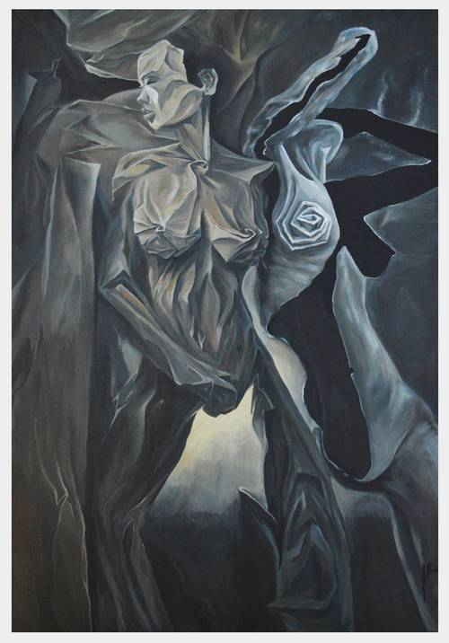 Obraz emanuje tajemniczością przez zastosowane szarości i subtelne kontrasty. Widać na nim złożone kształty przypominające ludzkie postacie, które wydają się tańczyć w wirze abstrakcji. Techniki malarskie są dość złożone – płynne pociągnięcia pędzla tworzą efekt miękkiego, ale nieco surowego reliefu. Atmosfera jest nieco oniryczna, jakby zatrzymana w sennej mgle. To art piece można interpretować jako eksplorację ludzkiej egzystencji i emocji. Kompozycja przyciąga uwagę swoją dynamiką, linie i kształty splatają się jak w intrygującym dance. Odbiorca może poczuć nutkę niepokoju, ale równocześnie fascynacji. Moje pierwsze wrażenie – wow, jakie to surrealistyczne! Przenikająca ciemność tła, w kontraście z delikatnie zarysowanymi postaciami, tworzy napięcie. Podziwiając ten obraz, można odczuć tajemniczą harmonię i nieuchwytne piękno. Dzieciak mógłby powiedzieć: "Patrzą na mnie duchy". Choć technicznie mistrzowski, dzieło to nosi w sobie pierwiastek przypadkowości. Takie blending of reality and abstraction zachęca do głębokiej refleksji.
