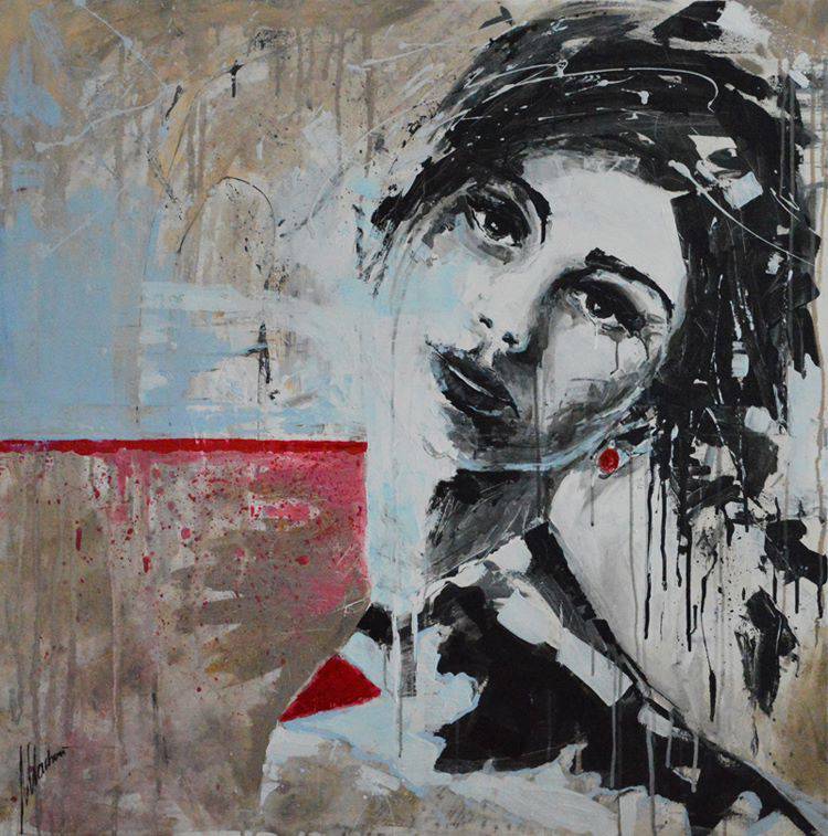 Obraz przedstawia portret kobiety, na którym dominują chłodne szarości i kontrastująca czerwień. Jej twarz wychyla się z kompozycji za pomocą miękkich, wyrazistych linii. Czarne akcenty włosów wprowadzają dynamikę, jakby właśnie przetoczył się gwałtowny podmuch wiatru. Tło jest abstrakcyjne, z rozmytymi plamami błękitu i beżu, które nadają uczucie pewnej nostalgii, a może nawet melancholii. To obraz pełen "enigmy", bo patrzysz i nie wiesz, o co chodzi, ale chcesz wiedzieć więcej. Artysta zastosował technikę mieszanej akwareli i gęstych impastów. Wyczuwa się tu swobodę ruchu pędzla, spontaniczność nakładania kolorów i tekstur, co tworzy efekt harmonijnego chaosu. Styl pochodzi jakby z pogranicza ekspresjonizmu i czegoś bardziej nowoczesnego, może street artu. Obraz emanuje spokojem, ale też tajemnicą, budząc różne emocje. Dla jednego może to być smutek, dla innego zaduma nad przemijalnością. A może po prostu jest to kobieta, która dzień przeżyła w zamyśleniu. Widok jej delikatnego uśmiechu i subtelnym spojrzeniem przywołuje uczucia bliskości i zrozumienia. "To wygląda jak moja mama!" – powiedziałoby 7-letnie dziecko, widząc znajomy wyraz twarzy. W tym wszystkim można poczuć, jak artysta bawi się przestrzenią i czasem, jakby próbował zamknąć chwilę w nieskończoności. Ten lekki dysonans między spokojem a intensywnością przyciąga i skłania do dłuższego zastanowienia. Co w niej jest takiego, że tak przyciąga wzrok?