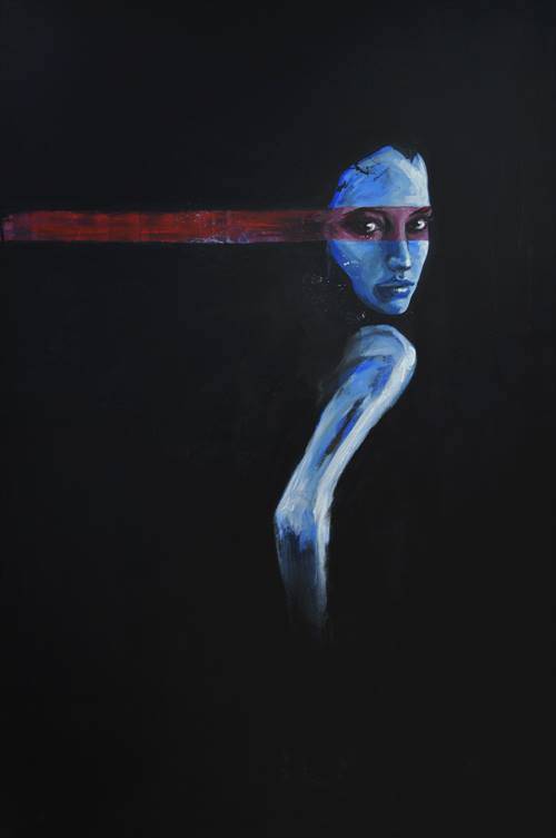 Na tym intrygującym obrazie dominuje ciemne tło, które niemal połyka postać o niebieskiej skórze. Twarz zwraca uwagę nasyconymi, intensywnymi barwami niebieskiego oraz czerwonego paska przecinającego oczy. Kompozycja jest minimalistyczna, co dodaje dziełu mistycznego uroku. Atmosfera jest tajemnicza, prawie jakby obraz miał opowiedzieć pewną nieznaną historię. Ktoś tu chyba coś skrywa. Styl artysty zdradza pewne wpływy surrealizmu, a technika, która przypomina plamy czystej farby, podkreśla ekspresyjny charakter dzieła. Emocje są tu subtelne, jednak chwilami mogą wywoływać uczucie zagubienia. Widz ma wrażenie, że niebieska postać patrzy prosto w duszę, zadając niemą, ale przejmującą pytanie. Odbiór obrazu może być różny, ale na pewno nie pozostawia obojętnym. Dla mnie to trochę jak sen, który nie do końca rozumiem, ale nie mogę zapomnieć. Wow, there's something captivating. Obraz przypomina o kruchości ludzkiego istnienia oraz o ukrytych emocjach. A może to coś zupełnie innego? Jakby pomalować marzenie grubą warstwą farby. Stykając się z tym dziełem, człowiek zaczyna zadawać sobie więcej pytań niż znalazł odpowiedzi.