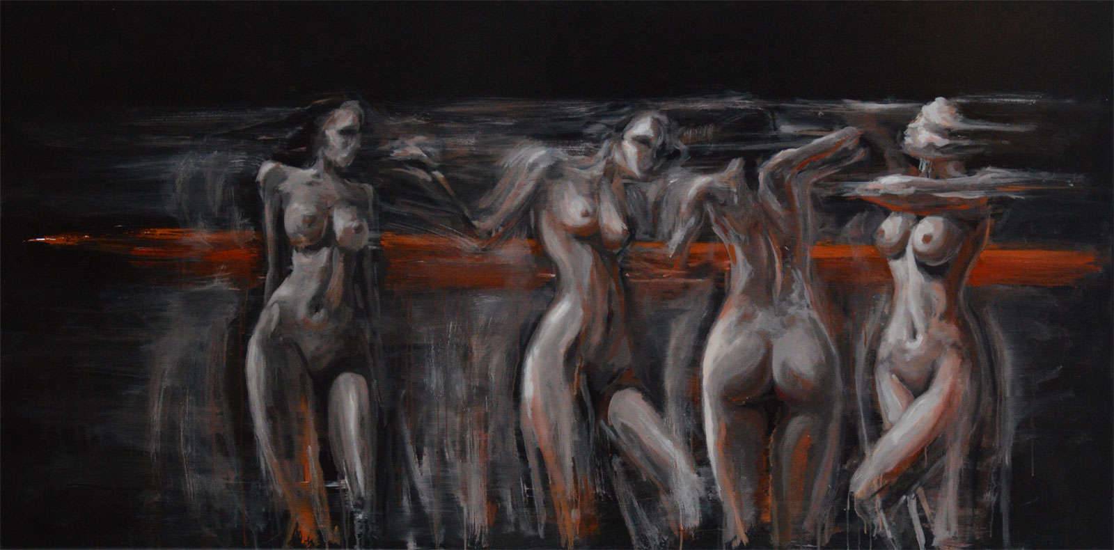 Obraz emanuje tajemniczością i dynamizmem. Ciemne tło kontrastuje z jasnymi sylwetkami czterech postaci, które wydają się być nieco rozmyte, jakby uchwycone w ruchu. Artysta użył techniki rozmycia, co nadaje dziełu eterycznego charakteru. Ciepłe, pomarańczowe akcenty dodają głębi i podkreślają kontury, tworząc wrażenie, że postacie są momentalnie oświetlone. Spontaniczność pociągnięć pędzla przypomina mi dziecięcą nieokiełznaną radość, kiedy coś się tworzy bez planu. Na pierwszy rzut oka można poczuć pewien niepokój. Nastrój obrazu jest zarówno melancholijny, jak i pełen energii. Czy te postacie to duchy przeszłości, czy może wizje przyszłości? Artysta wykorzystał tu wyjątkowo swobodny styl, gdzie każdy detal, choć rozmyty, jest przemyślany. Te figury wyglądają, jakby chciały opowiedzieć jakąś historię – opowieść ukrytą za warstwą koloru i cieni. Dzieciak mógłby powiedzieć: „To wygląda, jakby tańczą w ciemności!” I coś w tym jest. Każda z tych postaci zdaje się wyrażać coś innego – smutek, radość, może nawet złość. Wywołuje to refleksję nad naszymi własnymi emocjami. Zastosowanie techniki impasto może tu sugerować głębokie uczucia, które trudno wyrazić słowami. The entire piece feels like a fleeting moment, captured and yet elusive, pozostawiający widza z poczuciem niedopowiedzianego.