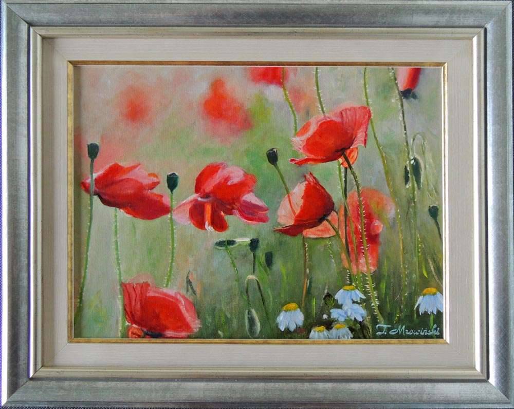 Obraz olejny przedstawia czerwony maki na łące. Łąka makowa często pojawia sie na obrazach które maluje.