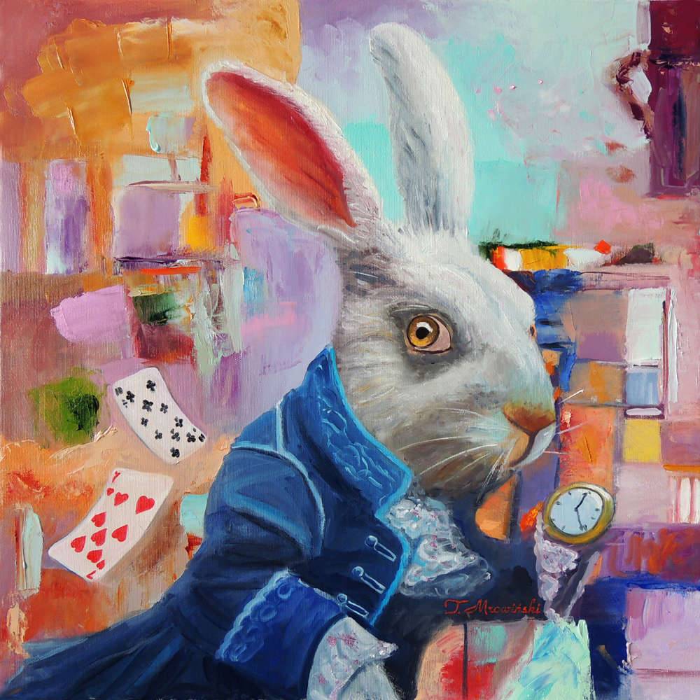 Obraz olejny Królik z krainy czarów. Surrealizm bajkowy. Impresyjny, dynamiczny i bardzo kolorowy obraz malowany szpachlą i pędzlem autor Tomasz Mrowiński