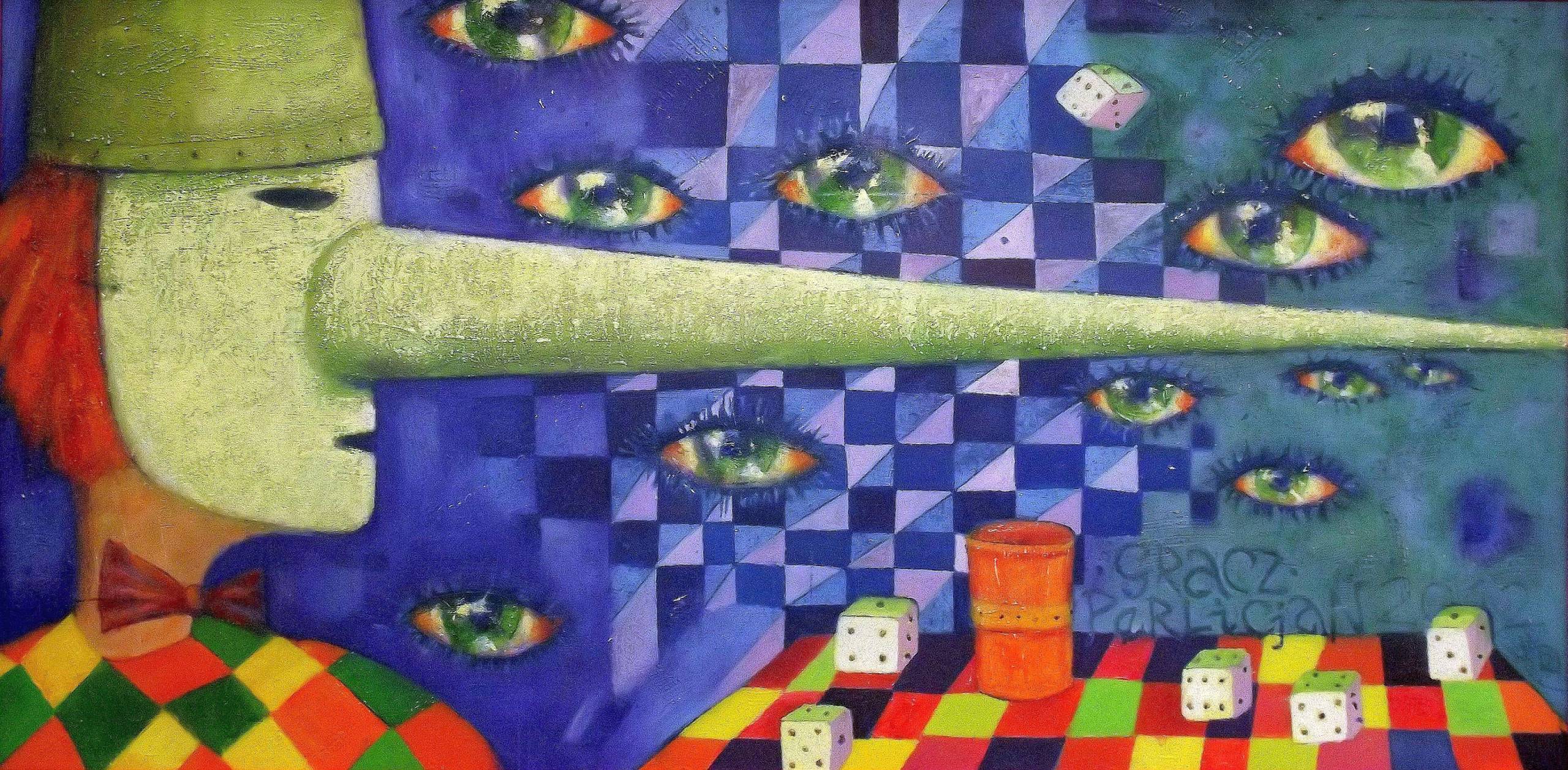 obraz olejny na płótnie, namalowany w 2012r ; Gracz to postać w masce z długim nosem, na tle geometrycznie kwadratowego nieba, z którego patrzą na widza ozy, wiele oczu. W dole obrazu po prawej stronie znajduje się stolik w kolorową szachownicę, na nim kubek i rozrzucone kości do gry. Panuje nastrój nadchodzącego wieczoru.