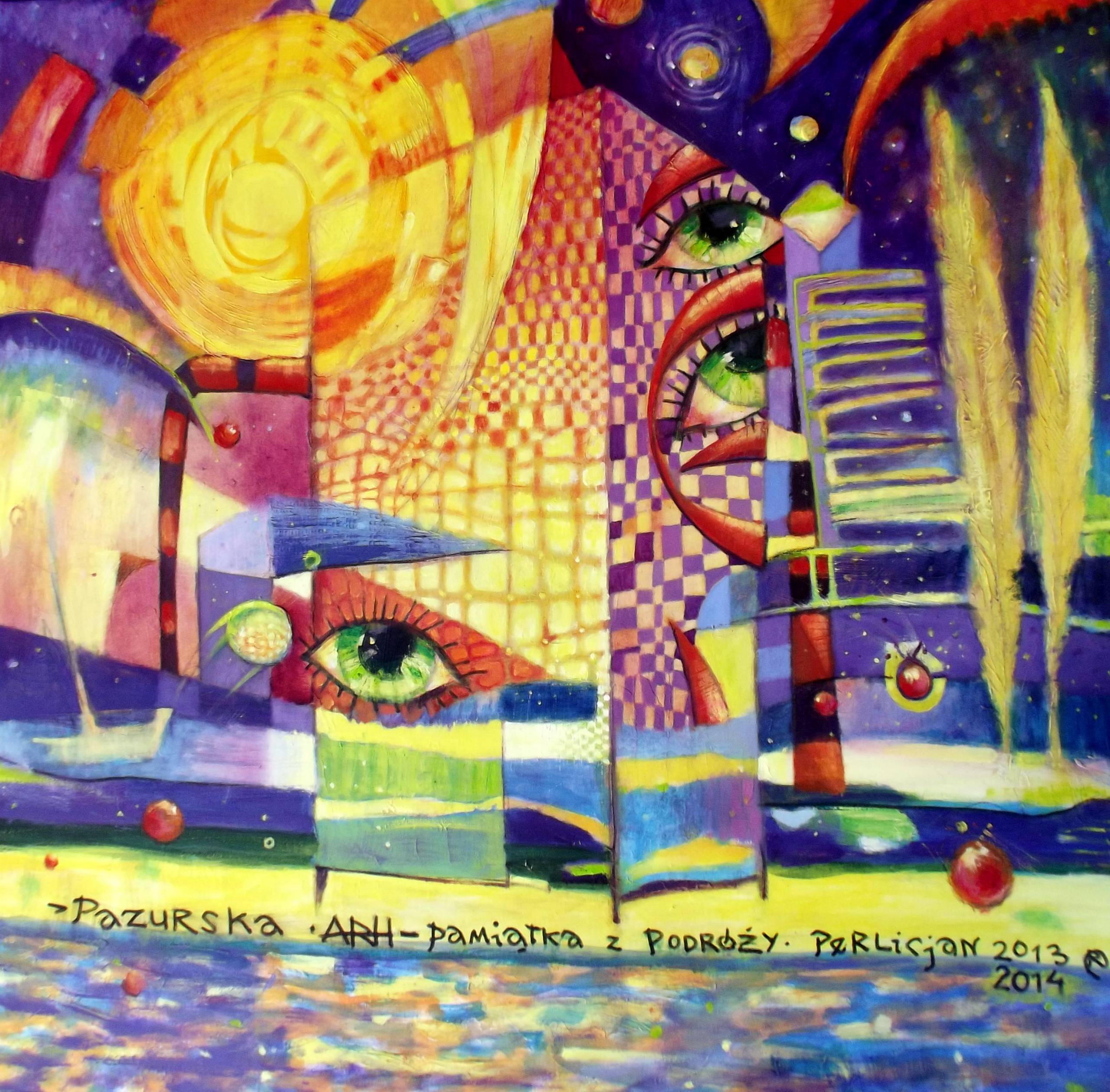 obraz olejny na płótnie, namalowany w 2013 - 2014r ; Kompozycja abstrakcyjno - figuratywna z wyłaniającymi się z tła zielonymi oczami.