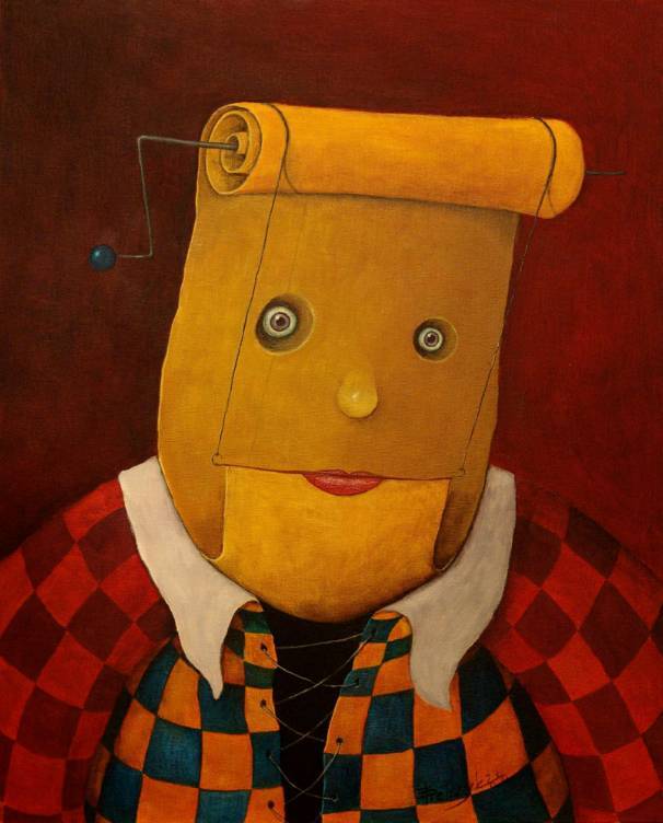 Na obrazie widać postać z głową przypominającą zrolowaną rolkę papieru. Dominują ciepłe kolory, jak żółć i czerwień, które tworzą dość surrealistyczną aurę. Tło jest jednolite, ciemnoczerwone, co dodaje dziełu głębi i jednocześnie podkreśla centralną figurę. Wyraz twarzy jest nieco zaskakujący, a oczy wyglądają na wytrzeszczone, dodając całości pewnej komiczności. Kompozycja obrazu jest prosta, lecz intrygująca. Atmosfera tego obrazu jest mieszanką humoru i absurdu. Styl przypomina nieco sztukę surrealistyczną, gdzie rzeczywistość miesza się z wyobraźnią. Technika malarska sugeruje użycie akrylu, z wyraźnymi, kontrastowymi pociągnięciami pędzla, co daje unikalną teksturę. Obraz może wywoływać różnorakie emocje, może intrygować i bawić widza. Jeden z moich osobistych wrażeń to "What a strange world we live in!", bo obraz wydaje sie celowo stworzony, by pobudzać myślenie i emocjonalne reakcje. Dla dziecka ten obraz może wyglądać jak śmieszny ludzik z rolką papieru na głowie. Na pewno jest to obraz, który zapada w pamięć i zachęca do zastanowienia się nad tym, jak rzeczywistość może być ukazana w sztuce na "przekręcony" sposób.