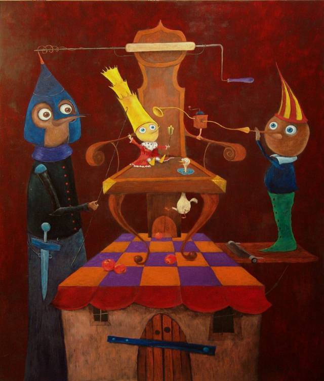 Ten obraz to prawdziwa uczta dla oczu! Na tle ciemnej czerwieni widzimy trzech dziwacznych bohaterów. Kolory są intensywne, pełne kontrastów – żółte, niebieskie i czerwone odcienie hipnotyzują. Kształty są geometryczne, niemal karykaturalne, przyciągają wzrok swoją niecodzienną formą. Kompozycja wydaje się chaotyczna, ale ma w sobie pewien intrygujący porządek. Wyczuwalna atmosfera surrealizmu tworzy nastrój zaciekawienia i delikatnego niepokoju. Artysta zastosował technikę, która miesza delikatny realizm z bajkowym surrealizmem. Postacie jak z bajki. To trochę jak sen, dziwny i tajemniczy. Zwraca uwagę sposób, w jaki artysta bawi się perspektywą i proporcją. Emocje wywoływane przez ten obraz są różnorodne – od radości po zdziwienie. Może nawet lekki niepokój, bo co ci ludzie robią z tym mieczem? Obraz wciąga w świat wyobraźni, zmusza do zatrzymania się i zastanowienia. Dlaczego mamy tu siedzące dziecko w koronie? To "puzzle" do rozwiązania. Patrząc na ten obraz, czuję, że to historia, którą trzeba opowiedzieć na wiele sposobów. To po prostu wow.