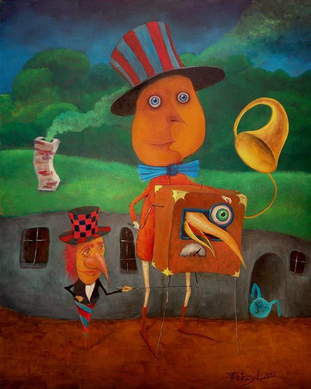 Obraz, który widzimy, jest naprawdę fascynujący, pełen żywych barw i surrealistycznej kompozycji. Intensywnie niebieskie tło przechodzi w zielenie, co nadaje przestrzeni głębi. Na pierwszym planie znajdują się dwie postacie o dziwnych, wydłużonych kształtach, przypominające postacie z sennego koszmaru. Jedna z nich ma głowę w kapeluszu jak z bajki, a zamiast tułowia widzimy dziwaczną skrzynkę z okiem. Atmosfera obrazu jest mieszanką tajemniczości i absurdalnego humoru. To jak być w "wonderlandzie" – niby trochę strasznie, a trochę zabawnie. Malarska technika wskazuje na inspirację surrealizmem, a może nawet dadaizmem. Użycie koloru jest odważne i pełne kontrastów, co dodatkowo wzmacnia uczucie dezorientacji. Obraz wywołuje wiele emocji – od zdumienia po lekki niepokój. Może też prowokować do refleksji na temat rzeczywistości i fikcji. Raz patrzę się na obraz, a potem ciągle myślę, co artysta chciał przez to powiedzieć. To takie intrygujące! Jak maluje artysta, to pewnie wkłada w to kawałek siebie. Obraz zaprasza do zabawy z wyobraźnią, jakbyśmy cofnęli się do czasów dzieciństwa.