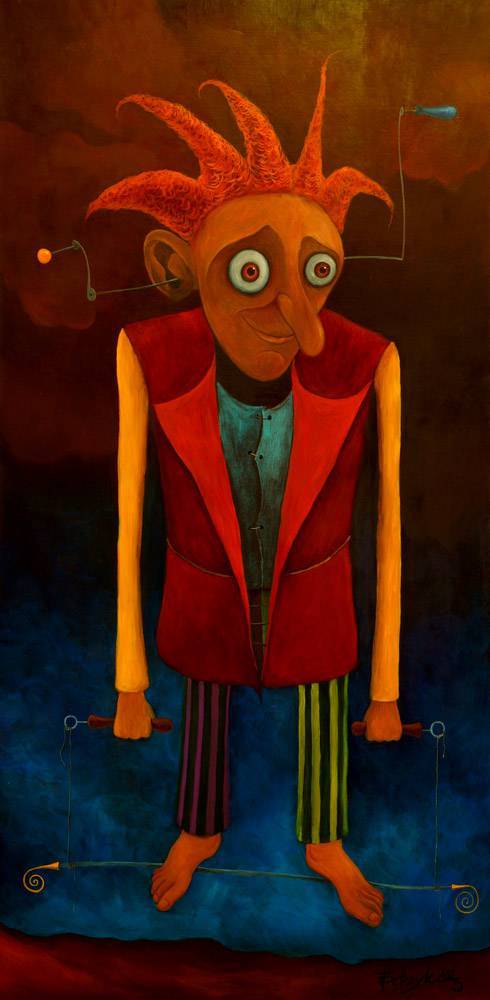 Na obrazie widać postać o intensywnych kolorach. Czerwone i pomarańczowe odcienie włosów przypominają płomienie, które dodają energii i dynamizmu. Twarz, z wyrazistymi oczami, patrzy prosto na widza, tworząc intrygujący kontakt. Tło w ciemnych, stonowanych barwach kontrastuje z jasnością postaci. Jest tu trochę creepy vibe, który potrafi zaskoczyć. Artysta użył wyrazistych, pociągnięć pędzla, co dodaje kompozycji ekspresji. To trochę jak obraz z bajki, ale z nutą surrealizmu. Styl przypomina marzenia senne, gdzie wszystko jest możliwe i nie do końca zrozumiałe. Patrząc na postać, można poczuć nieco niepokoju, a jednocześnie fascynacji. Hej, a może on jest magikiem? Myśli siedmiolatka czasem idealnie oddają istotę rzeczy. Wywołuje on uczucie ekscytacji i ciekawości, jakby zaraz miał coś powiedzieć. To dzieło, które zmusza do refleksji i budzi wewnętrzne „Wow”. Atmosfera jest pełna tajemniczości i zaskoczenia. Wow, naprawdę coś innego!