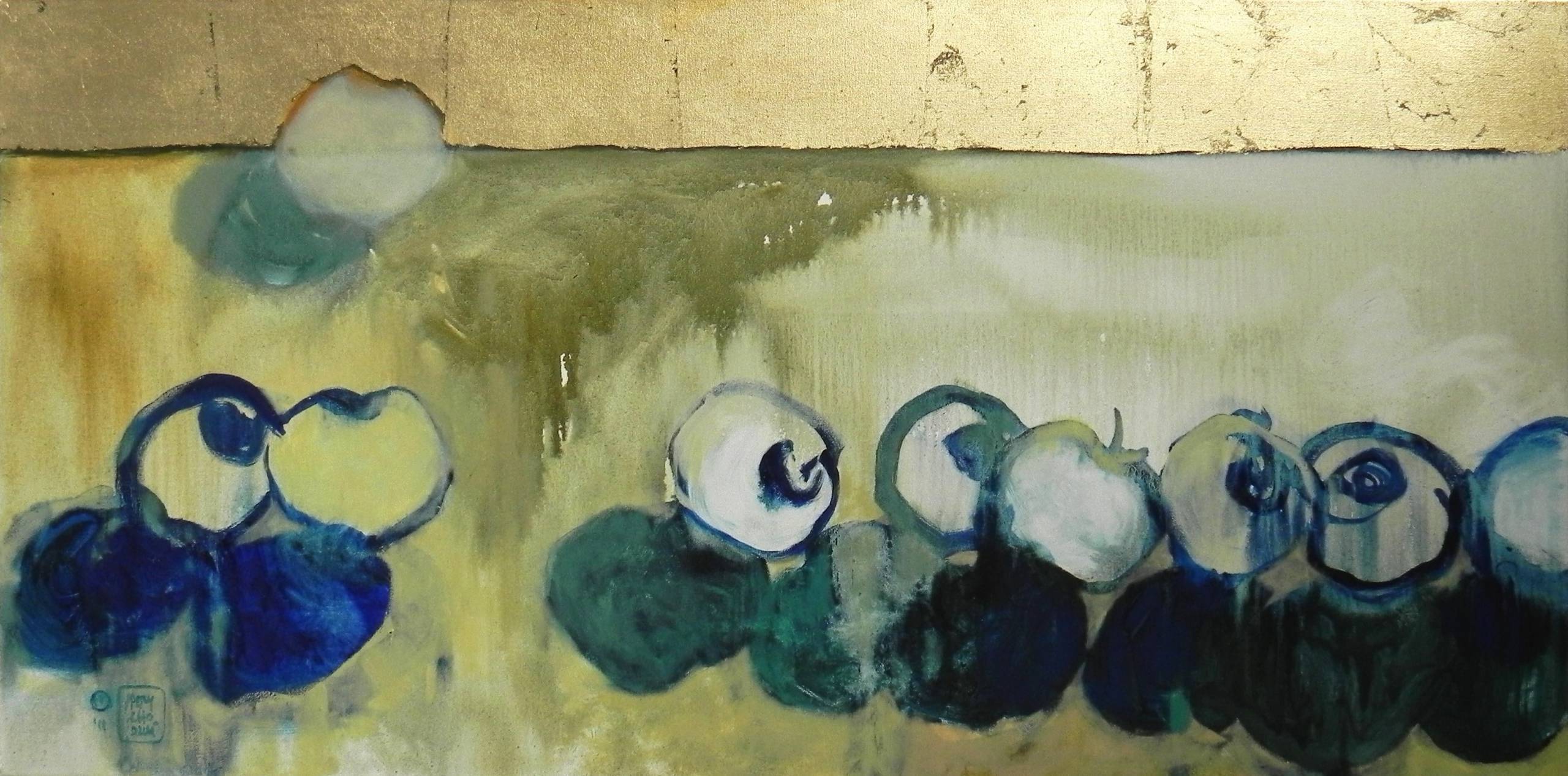Prezentowany obraz to unikatowe zastosowanie złotych płatków (szlakmetal) oraz tradycyjnego malarstwa olejnego.