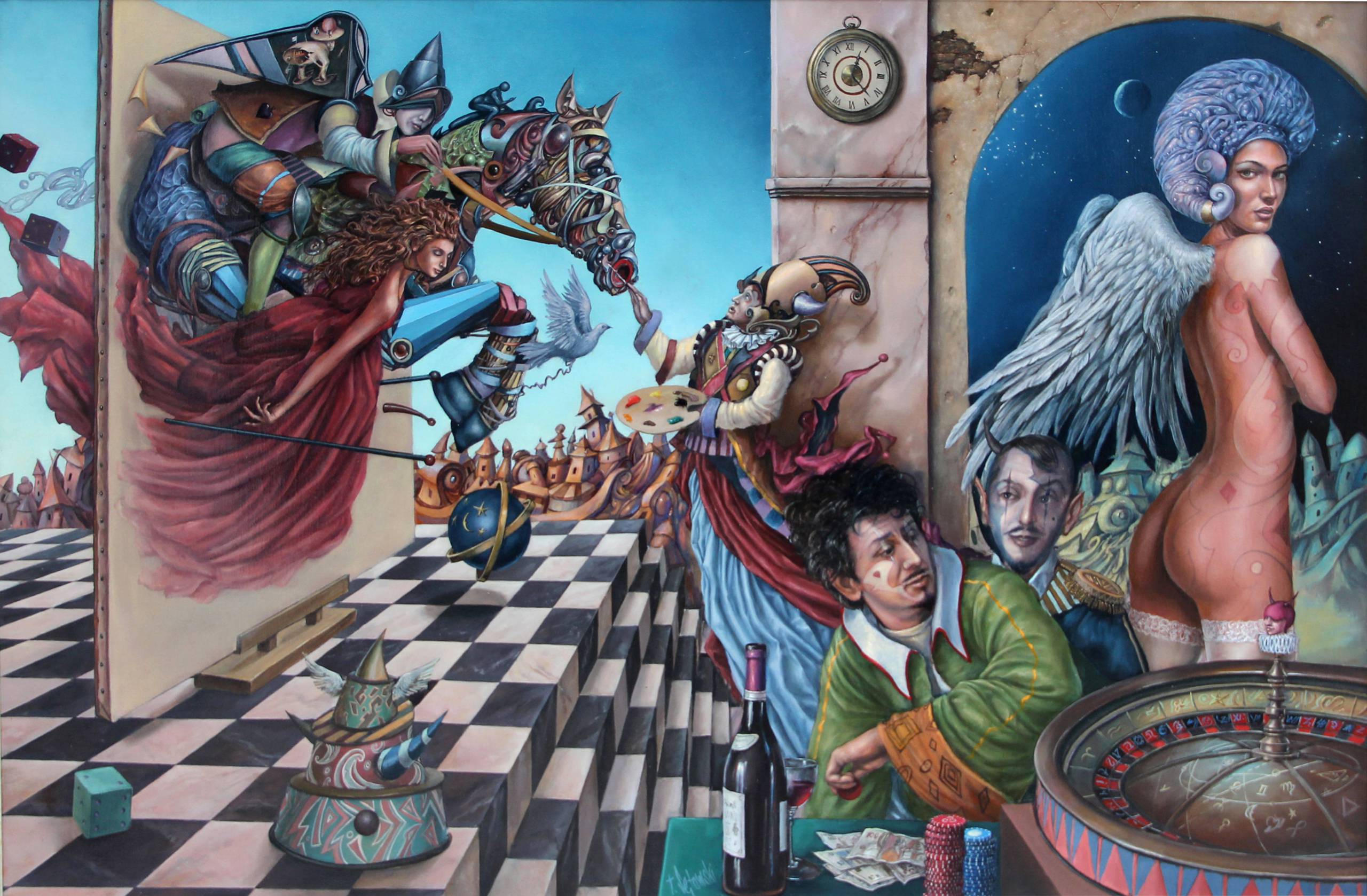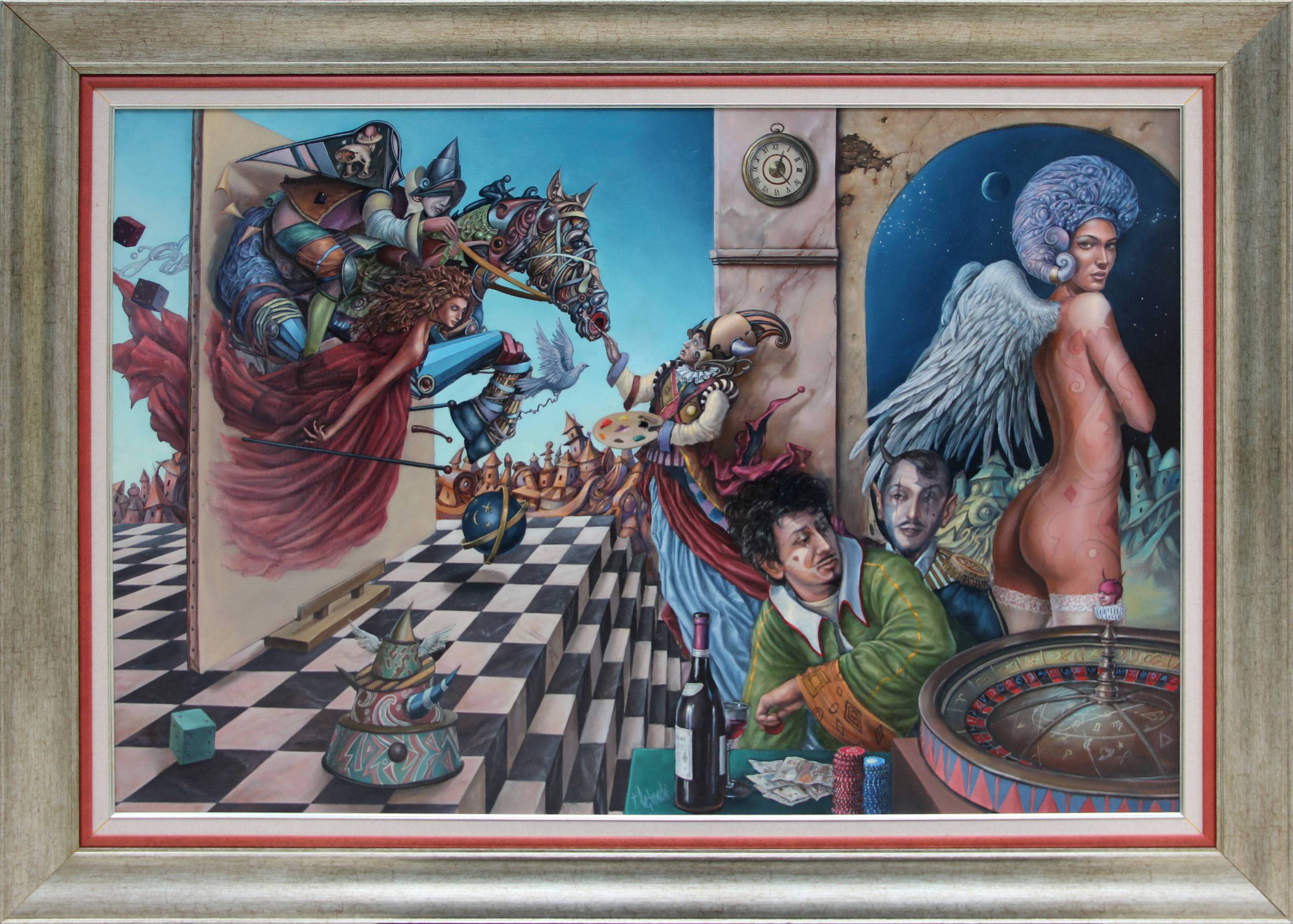 Na obrazie widać skomplikowaną i surrealistyczną scenę, która przyciąga wzrok feerią barw i zaskakującymi kształtami. Na pierwszym planie, na tle szachownicy, wyskakuje z płótna postać w czerwonej szacie, towarzyszy jej koń, którego zbroja połyskuje w odcieniach metalu. Obraz zachwyca dynamiczną kompozycją, pełną kontrastów między spokojem a chaosem. Jest jak wyjęty z sennego marzenia, gdzie w jednej chwili jesteśmy w wirze przygód i fantazji. Artysta operuje techniką, która przypomina renesansowe mistrzostwo, ale z nowoczesnym twistem. Elementy fantasy mieszają się z realistycznymi detalami i odważną paletą kolorów. Klimat jest pełen napięcia i tajemniczości — jakbyśmy oglądali fragment opowieści, której zakończenia nie znamy. Patrząc na obraz, można poczuć dreszczyk emocji i lekkie zaniepokojenie. Dziecko powiedziałoby: "To wygląda jak bajka!". I znów, wkracza tutaj to poczucie magicznej podróży. Obraz wywołuje wiele pytań i interpretacji — kim są ci ludzie, dlaczego to robią? To jest jak prawdziwa, emocjonalna karuzela, rzeczywistość spotykająca się z wyobraźnią. Wow, takiego dzieła nie widuje się codziennie.
