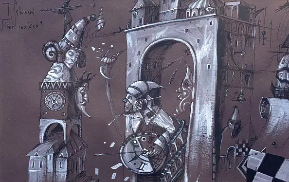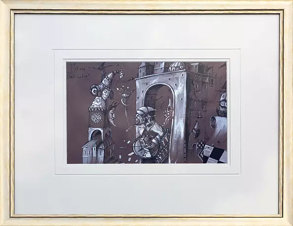 "Time Maker", akryl + piórko na kartonie, format 21x30 cm (w ramie 45x53 cm)