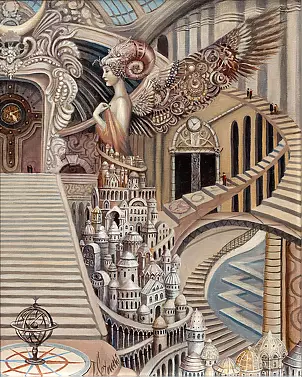 Ten obraz to prawdziwa uczta dla oczu. Przedstawia dwie rozbawione delfiny, które wyskakują z błękitnego morza, zdobiąc się eleganckimi kapeluszami. W tle słychać jakby magiczną orkiestrę na dziwnym statku. Kolory są intensywne, pełne życia, z przewagą błękitów i ciepłych brązów, które tworzą harmonijną kompozycję pełną dynamizmu. Atmosfera jest surrealistyczna, przypomina trochę sen, za którymi kryje się tajemnicza historia. Artyści zastosowali technikę olejną, co dodaje głębii i tekstury. Styl dzieła to wręcz fantasy, a artysta zgrabnie balansuje między realizmem a absurdem. Delfiny grają na emocjach widza, wywołując uśmiech i dziecięcą radość. Wow, one naprawdę skaczą! Każda postać na obrazie wydaje się być częścią bliżej nieokreślonej opowieści, pozostawiając pole dla wyobraźni. Patrząc na to, można poczuć się jak w tajemniczym spektaklu, z nutką humoru i lekkości. It's amazing, jak ten obraz potrafi wciągnąć i zatrzymać wzrok na dłużej, pozwalając oderwać się od codzienności i zanurzyć w bajkowym świecie.