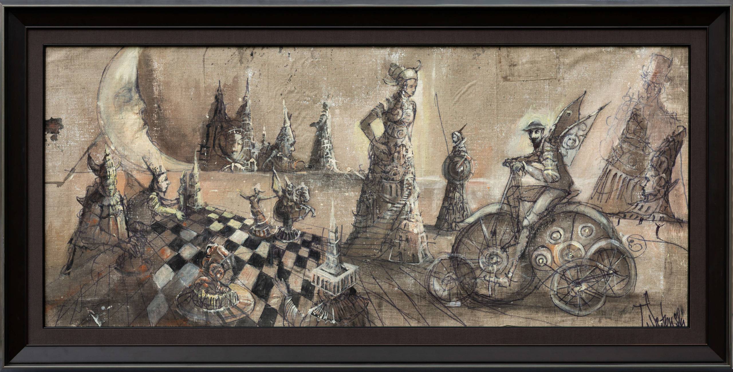 "Podróże Don Kichota", akryl, marker i gwasz na płótnie, format 150x66 cm (w ramie 170x86 cm) Proszę zwrócić uwagę na lekko warsztatowo nieuczesany charakter pracy. U góry widoczna jest duża łata na płótnie. Można było ją nakleić z tyłu, ale Artysta świadomie zrobił to na froncie by nadać obrazowi bardziej ekspresyjnego, szalonego - jak tytułowy bohater charakteru :)