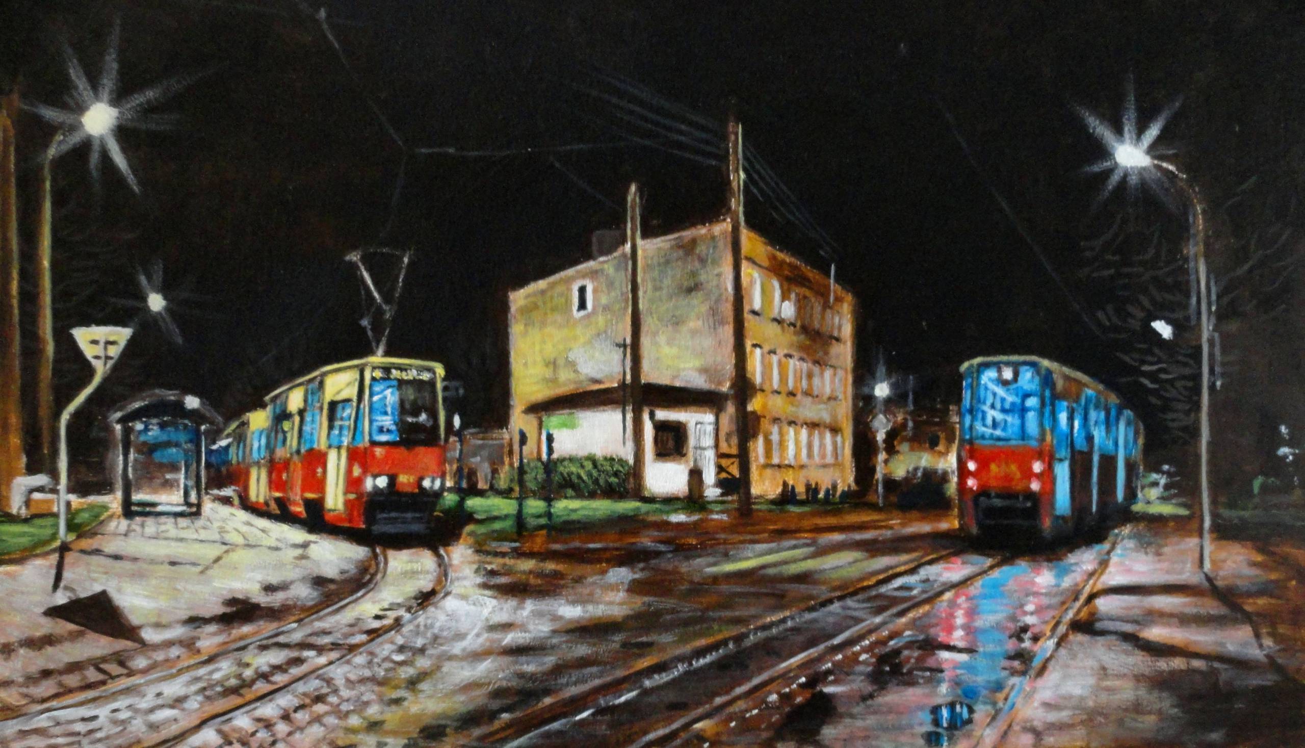 Obraz przedstawia nocną scenę miejską, zdominowaną przez intensywne światła latarni ulicznych odbijające się na mokrym bruku. Kolory są stonowane, choć przeważa żółć i czerwień tramwajów, które dodają życia ciemnej ulicy. Kompozycja jest niezwykle dynamiczna; dwa tramwaje ustawione naprzeciw siebie tworzą ciekawy kontrast i wzbudzają wrażenie momentu przygotowania do odjazdu. Atmosfera dzieła jest nostalgiczna, emanuje spokojem wieczoru przerywanym jedynie przez tajemniczość nocnego miasta. Artysta posługuje się techniką akrylową, co można wywnioskować z wyrazistości barw i efektu "wet look" na chodniku. Sposób, w jaki światło i cień rozgrywają się w tej scenerii, przywodzi na myśl malarstwo impresjonistyczne, choć z nowoczesnym twistem. Patrząc na obraz, można poczuć się jak w centrum życia miasta, które mimo późnej pory tętni ukrytym rytmem. Wydaje się, że za chwilę usłyszymy dźwięk ruszającego tramwaju - "Bo ja chce się tam zabrać!" - powiedziałby 7-latek, zauroczony światełkami. Całość jest bardzo "cozy", jakby zachęcała do zanurzenia się w rzeczywistość miejskiego wieczoru.