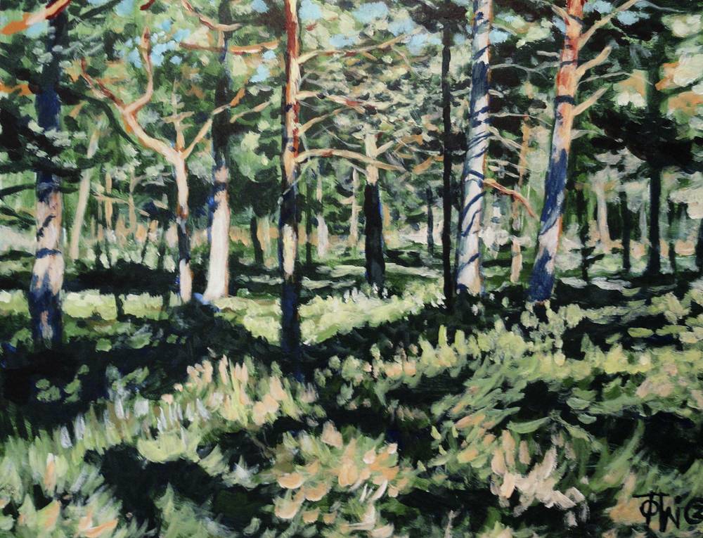 Obraz przedstawia leśny pejzaż, gdzie światło słoneczne igra między gałęziami drzew, rzucając charakterystyczne cienie na ziemię. Dominują tutaj zielone i brązowe odcienie, które współgrają ze sobą, tworząc harmonijną kompozycję pełną życia. Kształty drzew są dynamiczne, pnie wiją się ku niebu. Klimat dzieła jest spokojny, ale jednocześnie tętni ciszą lasu, przerywaną jedynie szumem liści i śpiewem ptaków. Artysta wykorzystał impresjonistyczne techniki, pociągnięcia pędzla są widoczne, co dodaje obrazowi "touch" autentyczności. To jakby spojrzenie na naturę przez lekko rozmytą szybę. Emocje, jakie może wywoływać ten obraz, to spokój i nostalgia za dzieciństwem, kiedy biegaliśmy beztrosko po lasach. Obraz może prowokować refleksję nad pięknem natury i potrzebą jej ochrony. Pisząc to, prawie czuć świeże powietrze i zapach sosnowego igliwia. Moja reakcja? Chciałbym tam być, zanurzyć się w tej zielonej otchłani. Mogę sobie wyobrazić, jak dziecko mówi: "Las wygląda jak magiczny ogród pełen tajemnic". Autor poprzez swoją pracę zachęca do zwrócenia uwagi na to, co przyroda ma do zaoferowania, i jak ważne jest, by nie zatracić kontaktu z nią w naszym codziennym życiu.